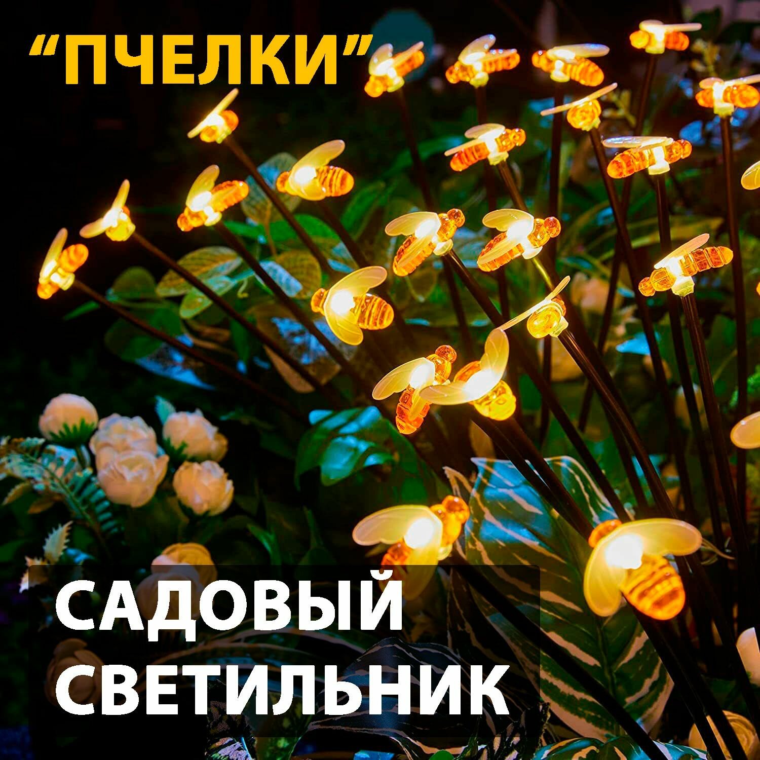 2 шт. Декоративный садовый уличный светильник на солнечной батарее "Пчелы" 6 пчелок, на гибком основании