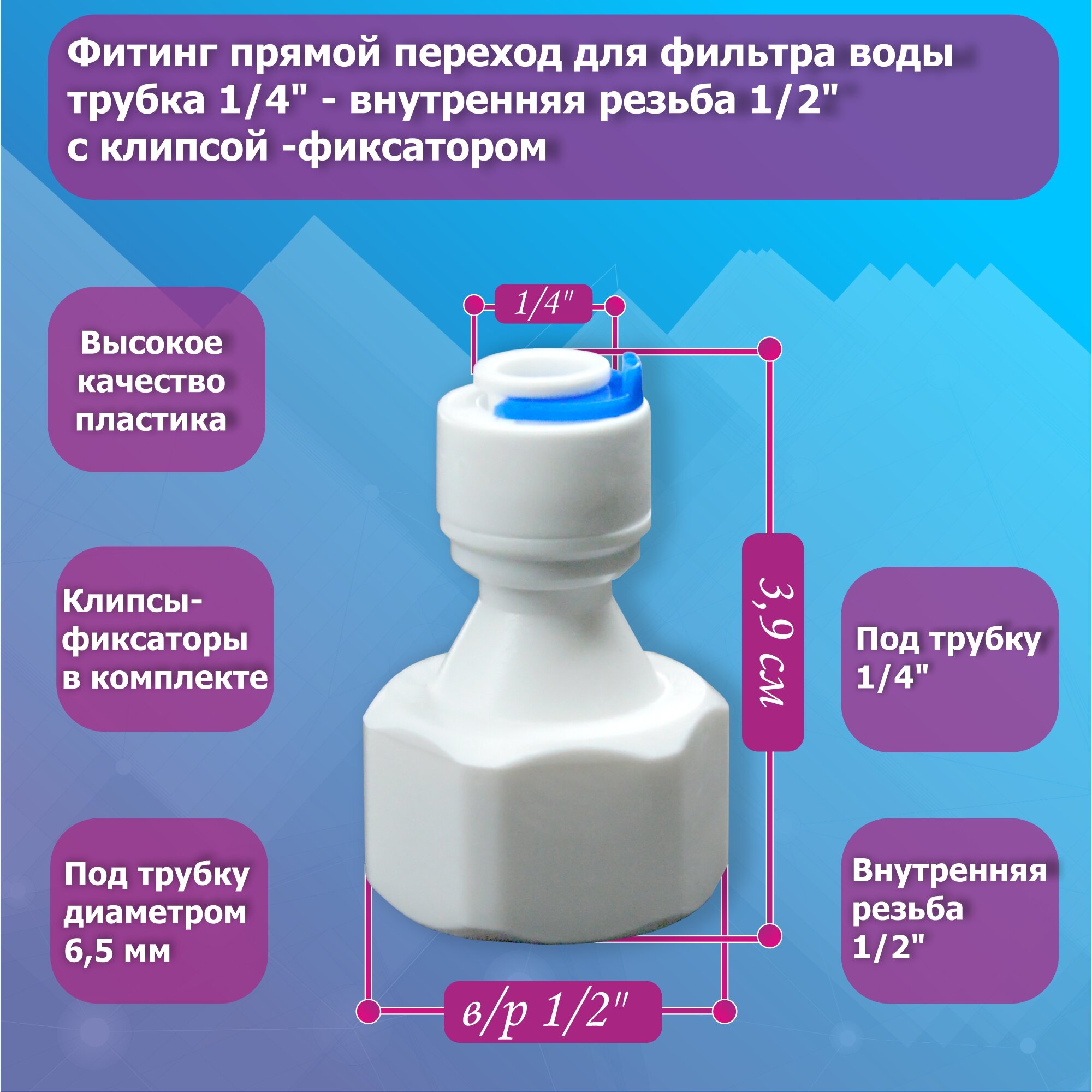 Ниже Вы можете прочитать отзывы на Фитинг прямой переход для фильтра воды трубка 1/4" - внутренняя резьба 1/2" с клипсой-фиксатором, ознакомится с подробными характеристиками, посмотреть интересные обзоры и фотографии на Фитинг прямой переход для фильтра воды трубка 1/4" - внутренняя резьба 1/2" с клипсой-фиксатором.