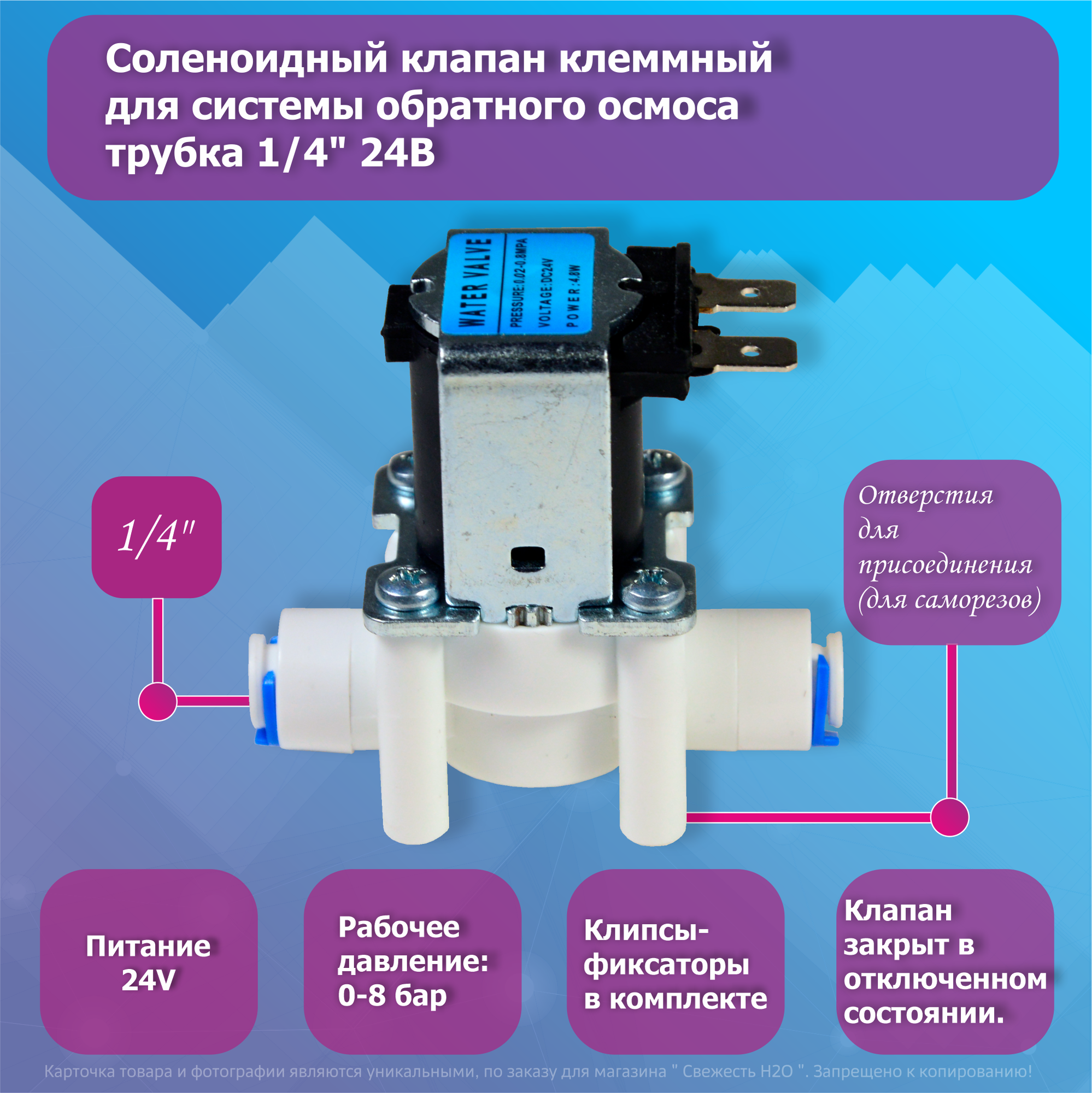 Соленоидный клапан клеммный для системы обратного осмоса, трубка 1/4" 24В интересное: