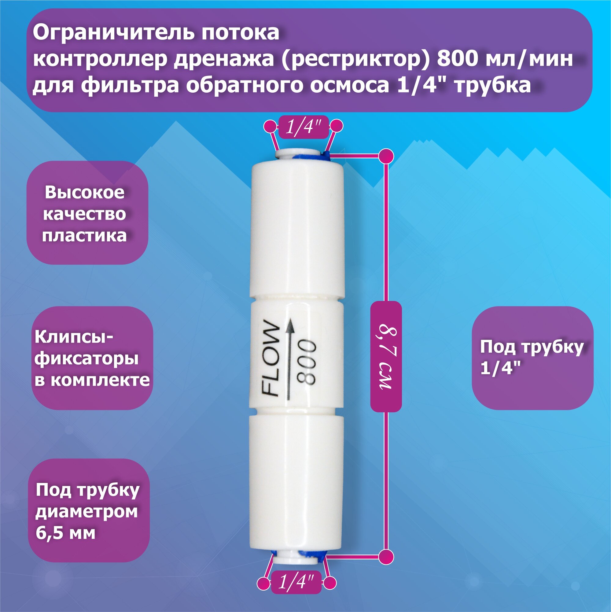 Ограничитель потока/контроллер дренажа (рестриктор) 800 мл/мин для фильтра обратного осмоса 1/4" трубка интересное:
