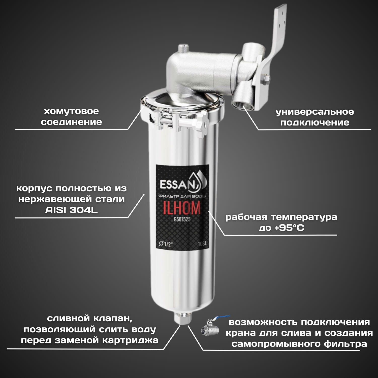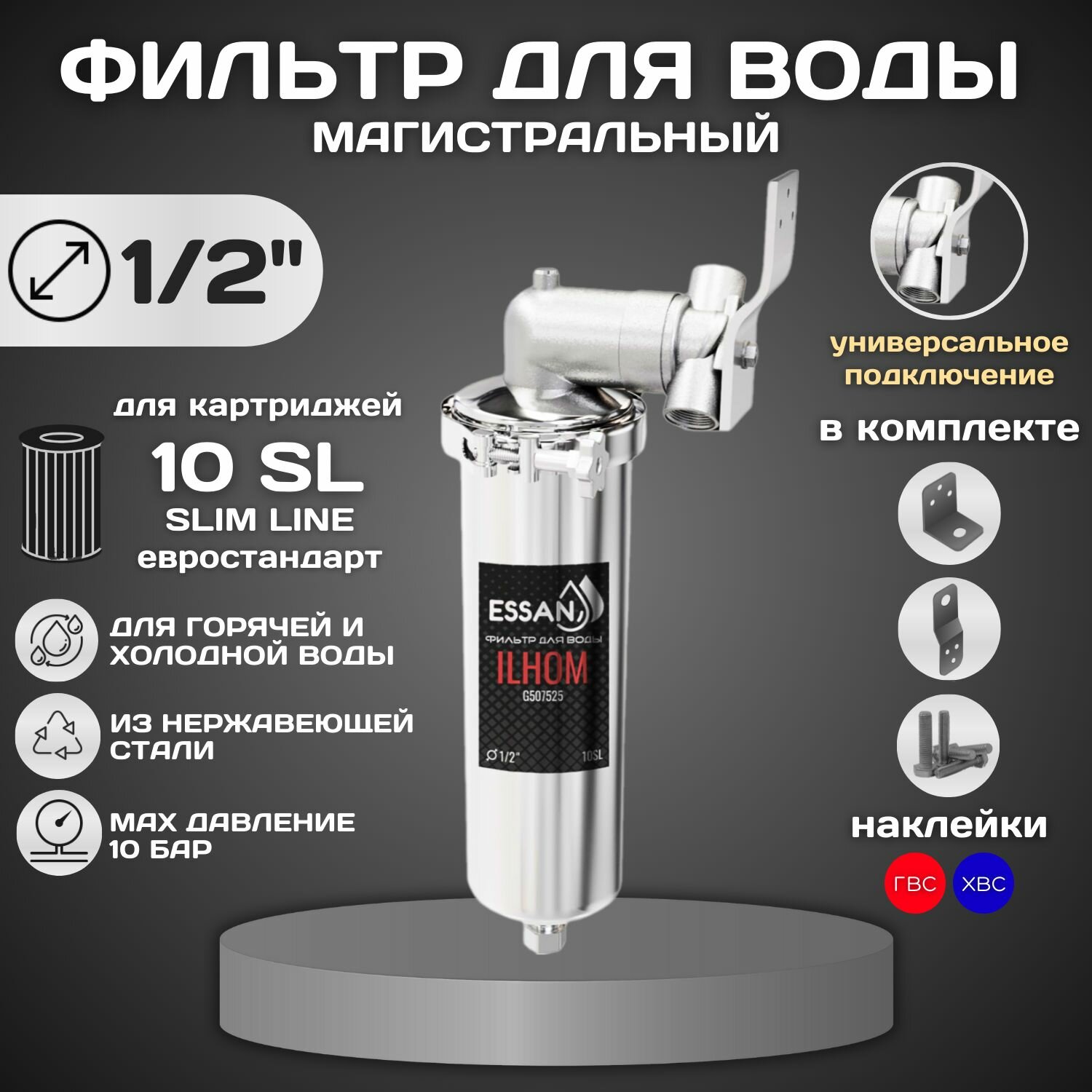 Фильтр колба проточная для магистрального водоснабжения ESSAN ILHOM 10SL 1/2 Slim Line Корпус для фильтра горячая и холодная вода, 507525 интересное: