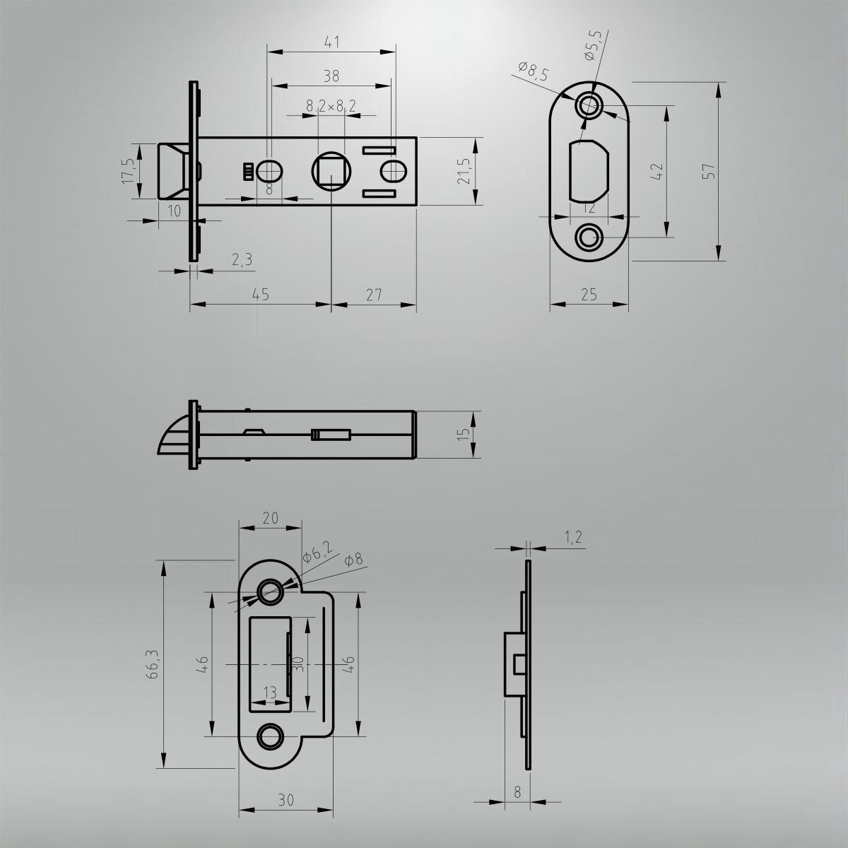 Защелка для межкомнатных дверей, цвет графит, сталь, врезная