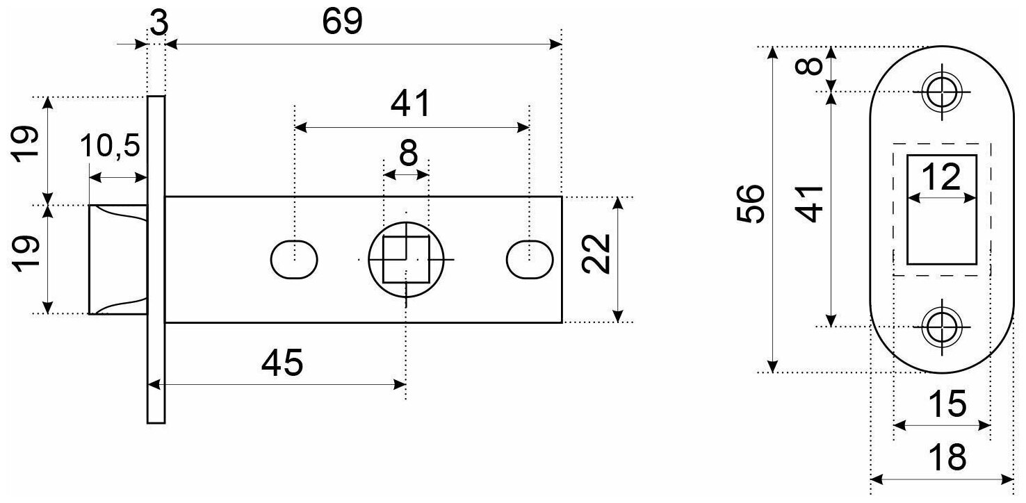 Защелка дверная межкомнатная врезная Аллюр АРТ L45-8-PR18 CP хром бесшумный язычок, овальная торцевая планка 18 мм