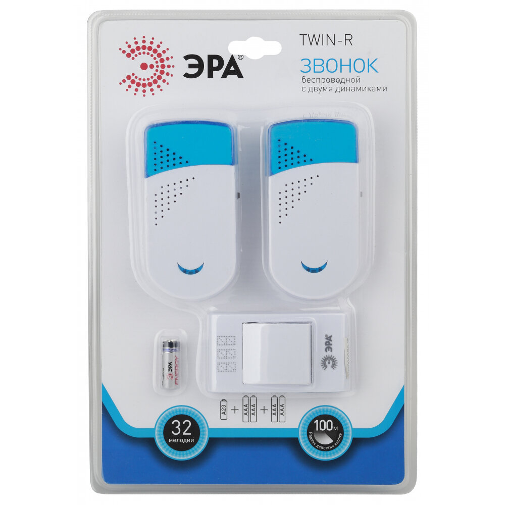 Купить Дверной звонок беспроводной ЭРА TWIN-R на батарейках, белый, 2 динамика, 32 мелодии, 100 м, IP20