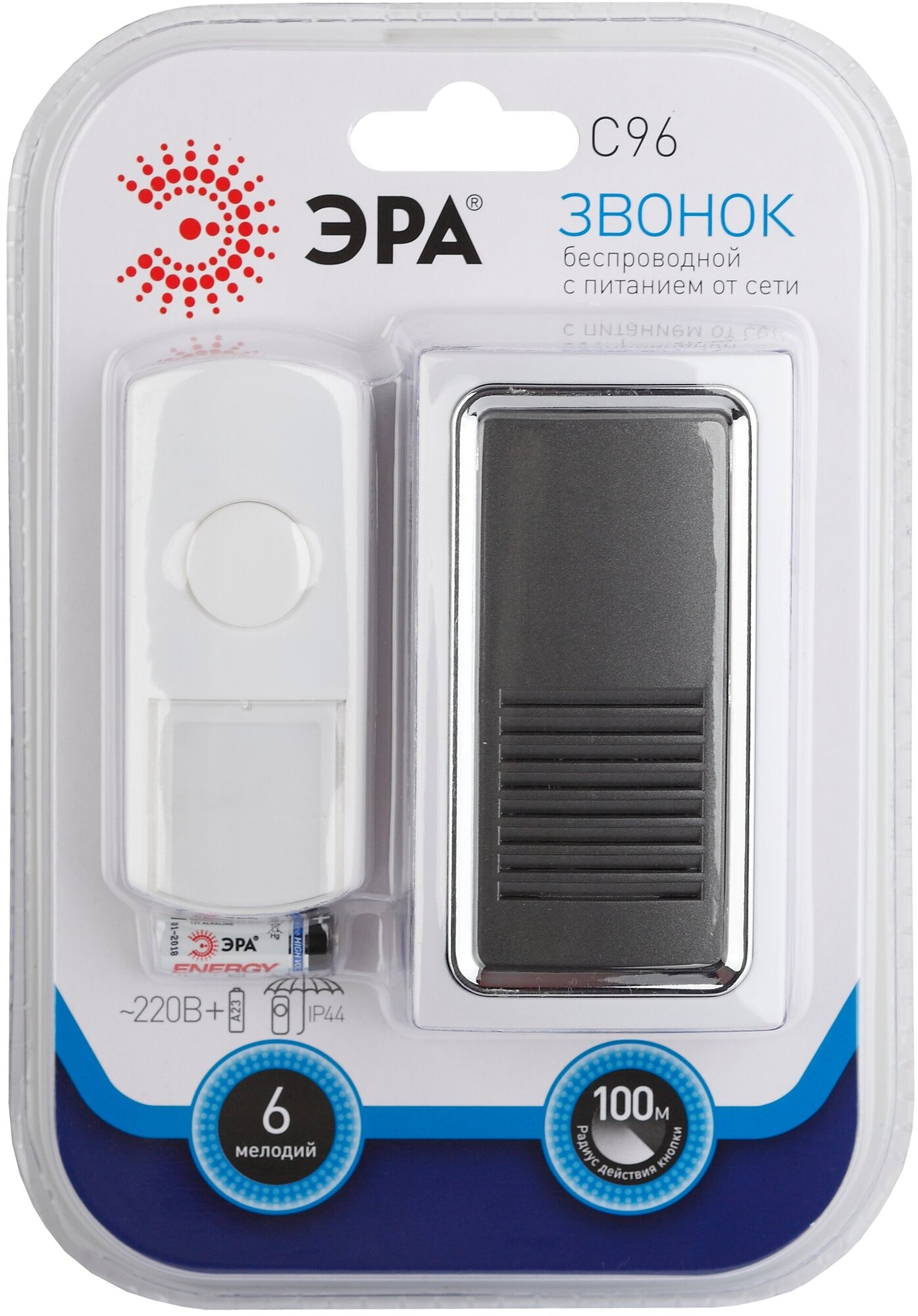 Звонок ЭРА C96 б/проводной, 220В+А23, 25 мел, кнопка IP44 (1/20/60) =5055945516012= интересное: