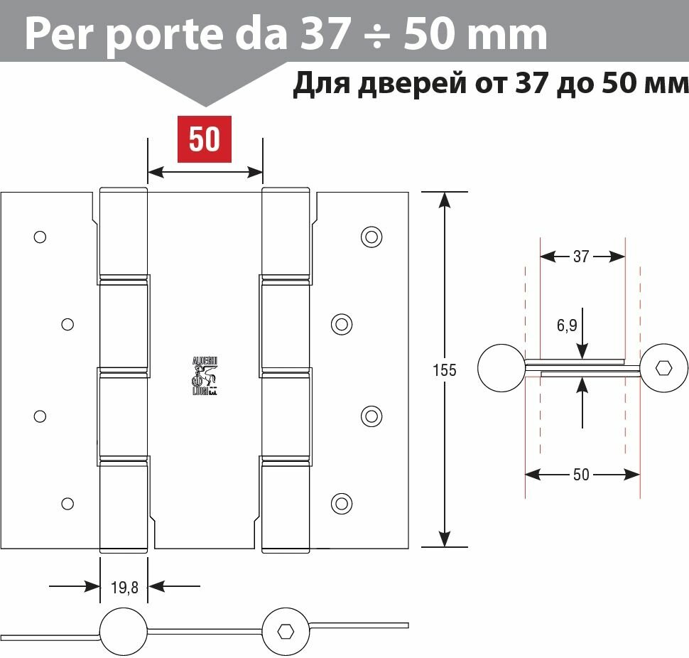 Петля барная, двойного действия ALDEGHI LUIGI SpA, 155х37х50 мм, цвет: хром, 2 штуки