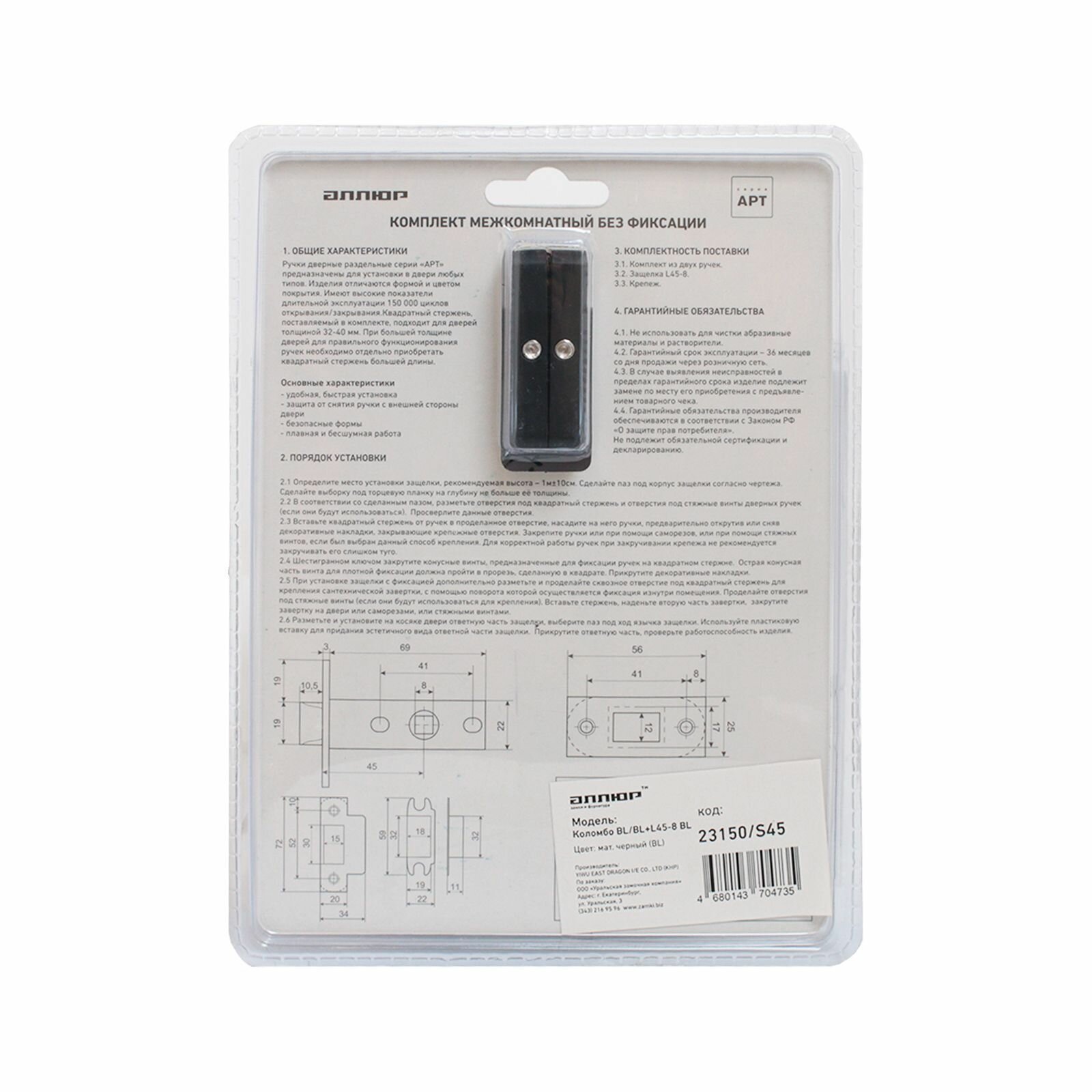 Комплект межкомнатный ручка и защелка аллюр АРТ "коломбо" BL (23150/S45), матовый черный интересное: