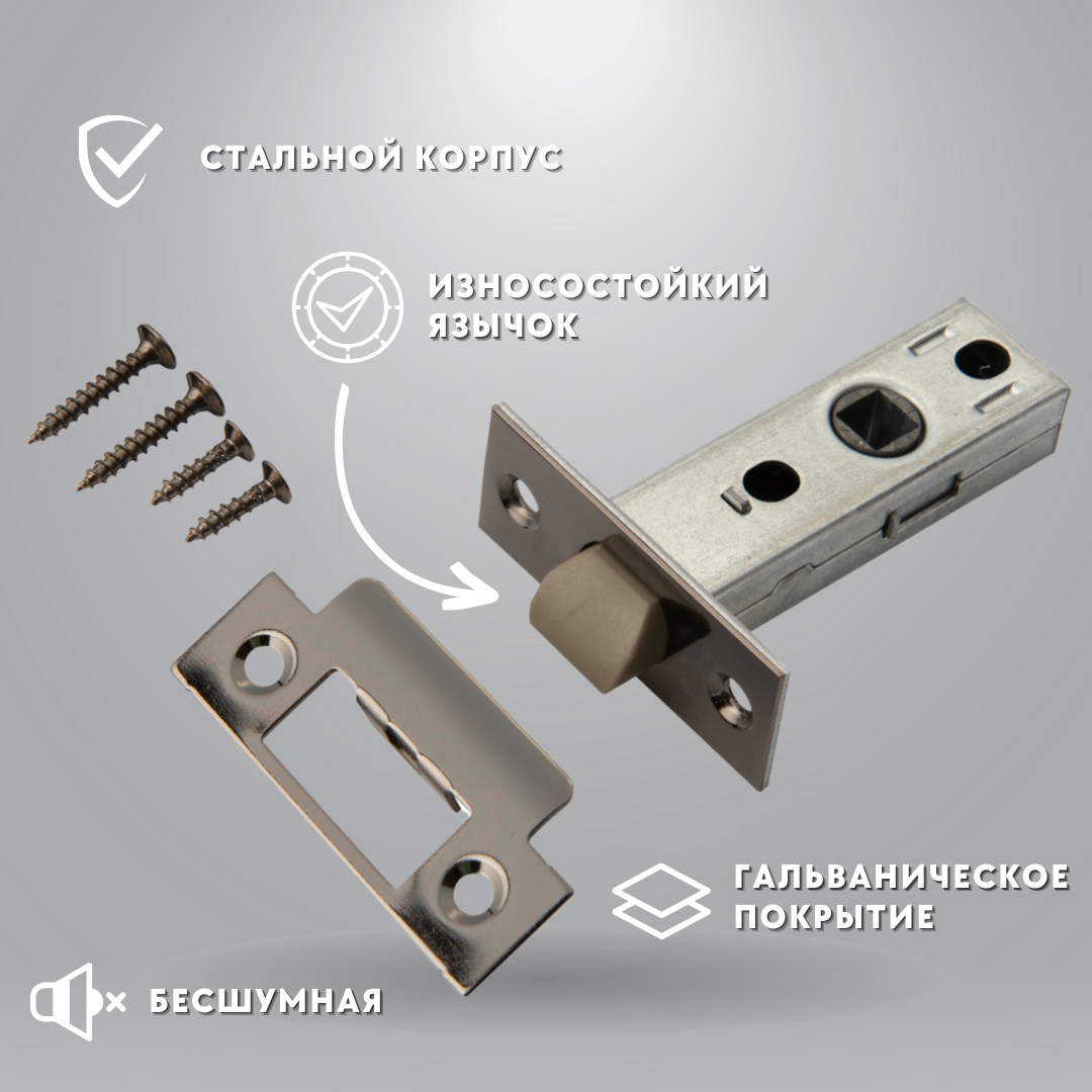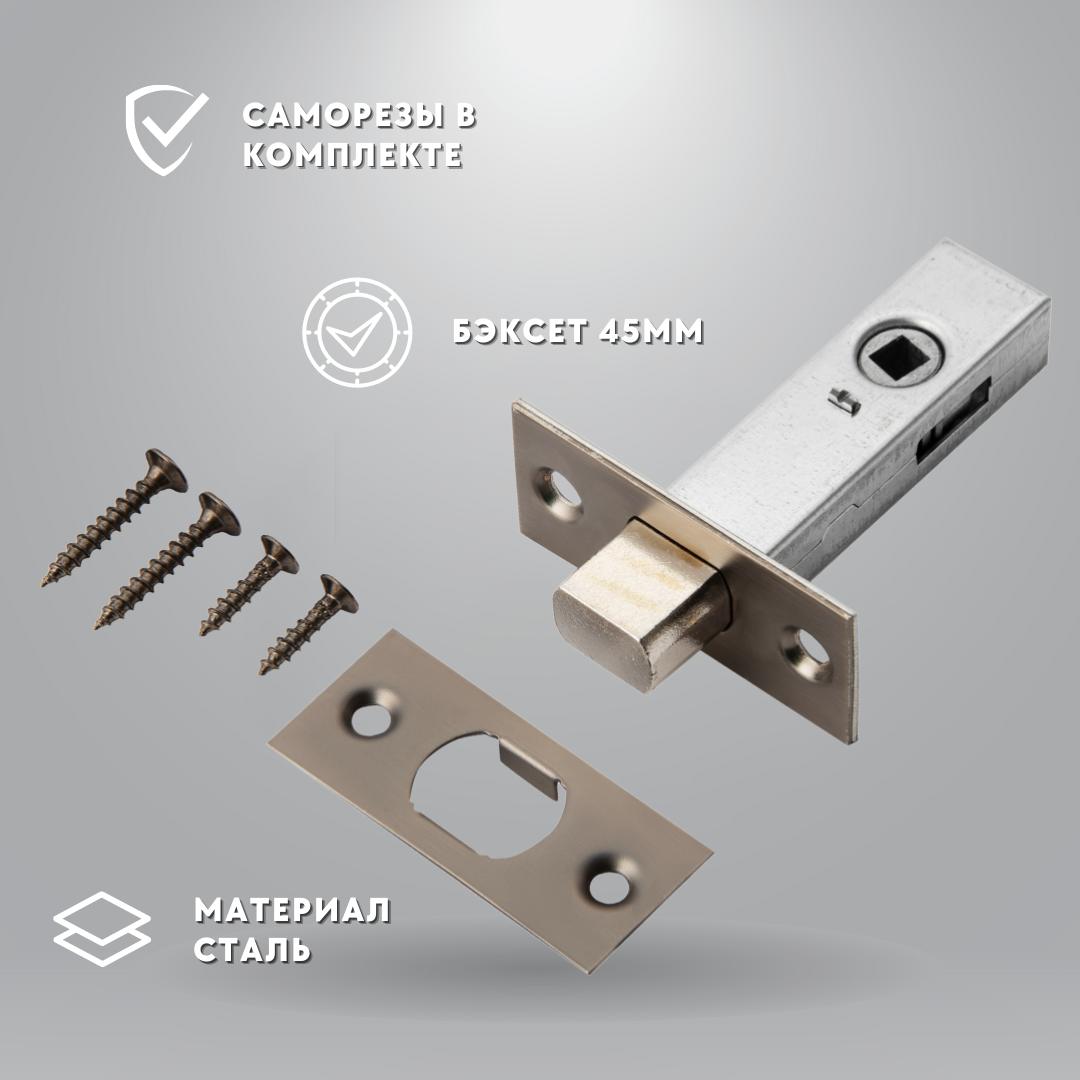 Ручка дверная межкомнатная, с защелкой +задвижка +завертка + петли врезные, цвет никель, квадратные, комплект
