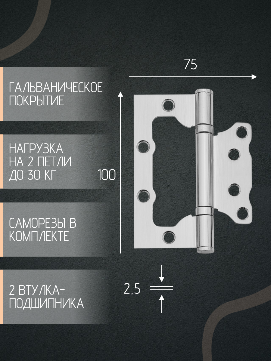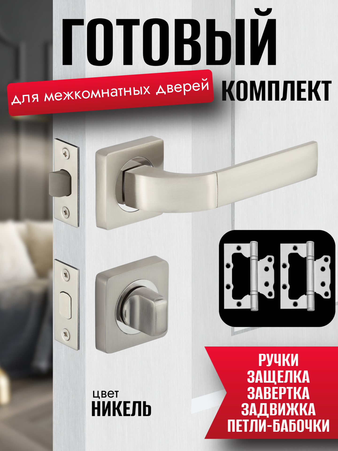 Ручка дверная межкомнатная, с защелкой +задвижка +завертка + петли врезные, цвет никель, квадратные, комплект
