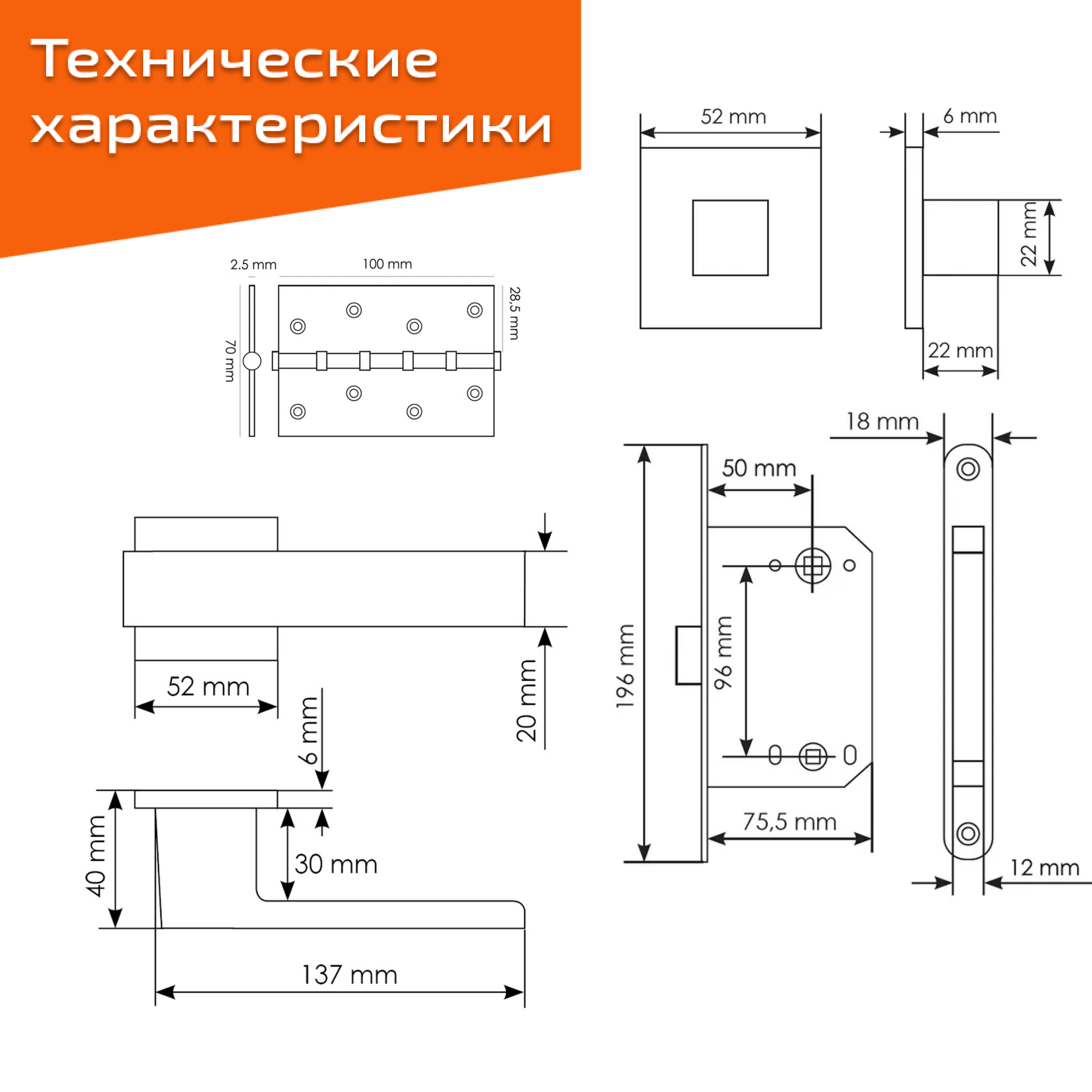 Комплект для межкомнатной двери Morelli / Дверная ручка MH 56 S6 BL + поворотник + бесшумный замок + врезные петли / черный матовый