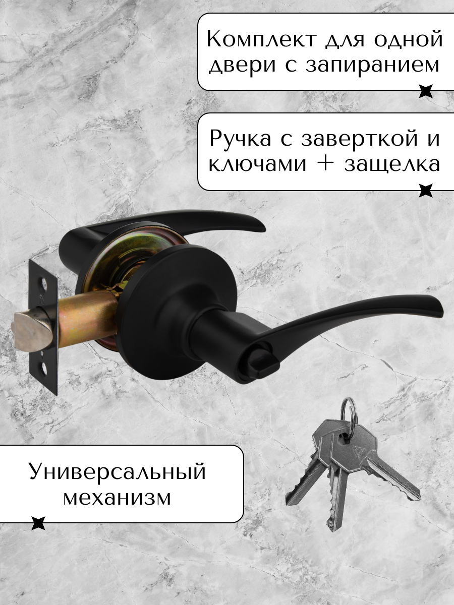 Ручка дверная межкомнатная черная с защелкой и заверткой без ключей, комплект
