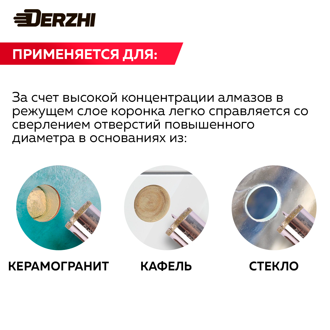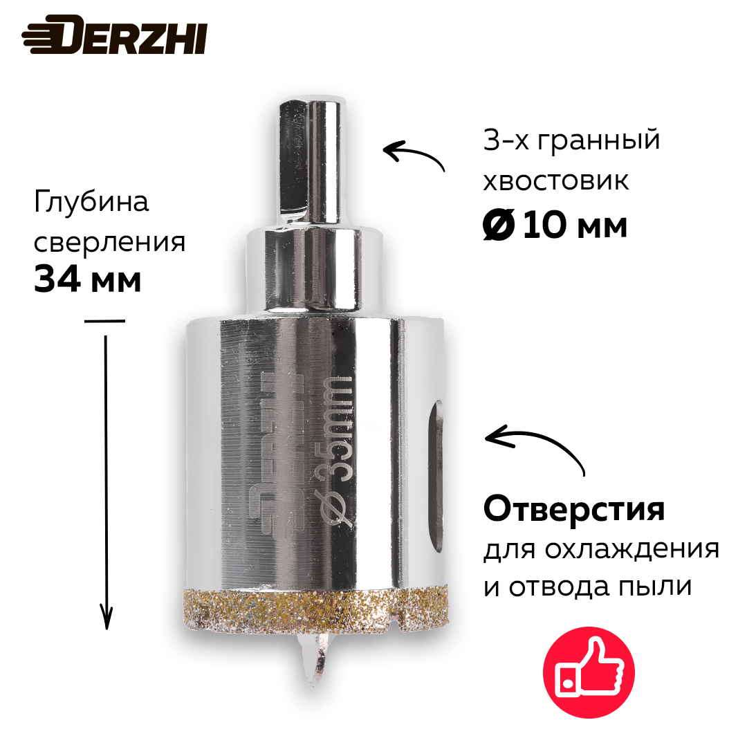 Ниже Вы можете прочитать отзывы на Коронка алмазная с центровочным сверлом для керамики, стекла, керамогранита, 35 мм DERZHI, ознакомится с подробными характеристиками, посмотреть интересные обзоры и фотографии на Коронка алмазная с центровочным сверлом для керамики, стекла, керамогранита, 35 мм DERZHI.