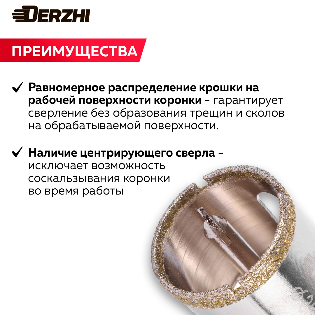Коронка алмазная с центровочным сверлом для керамики, стекла, керамогранита, 68 мм DERZHI