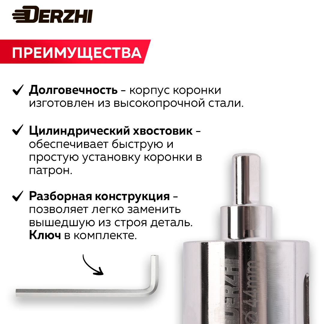 Купить Коронка алмазная с центровочным сверлом для керамики, стекла, керамогранита, 44 мм DERZHI