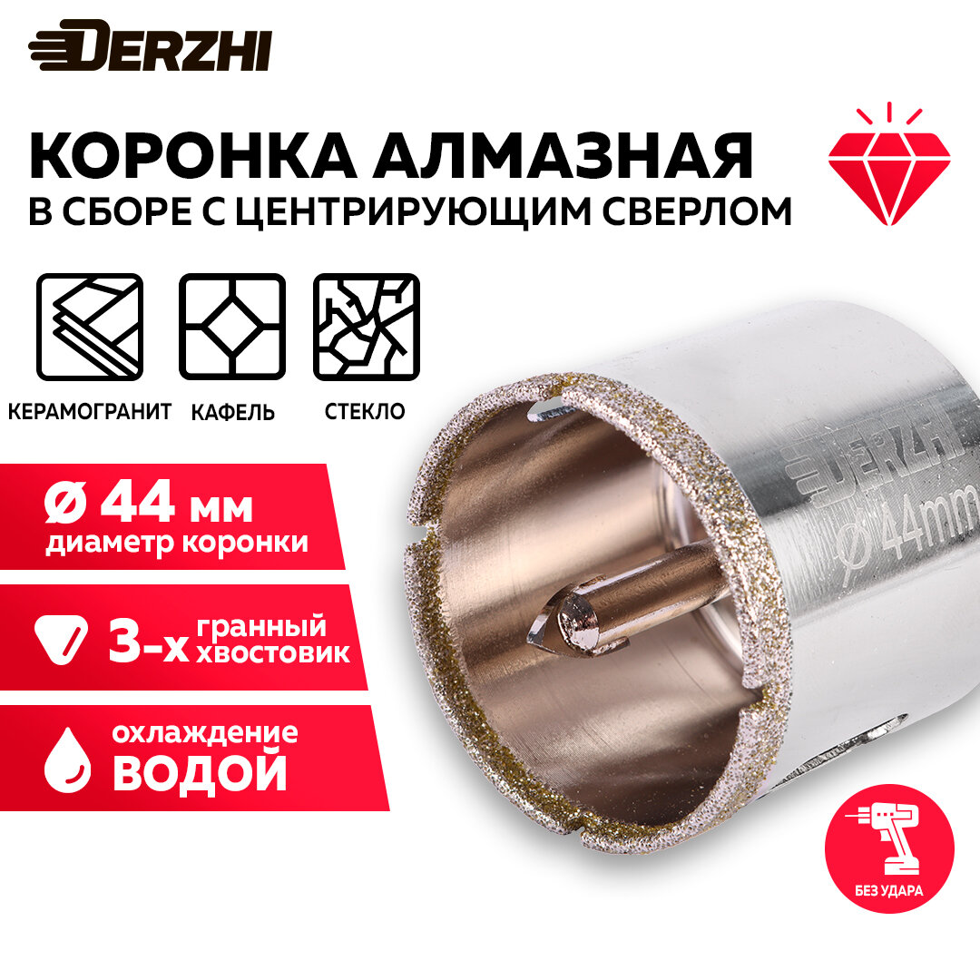 Ниже Вы можете прочитать отзывы на Коронка алмазная с центровочным сверлом для керамики, стекла, керамогранита, 44 мм DERZHI, ознакомится с подробными характеристиками, посмотреть интересные обзоры и фотографии на Коронка алмазная с центровочным сверлом для керамики, стекла, керамогранита, 44 мм DERZHI.