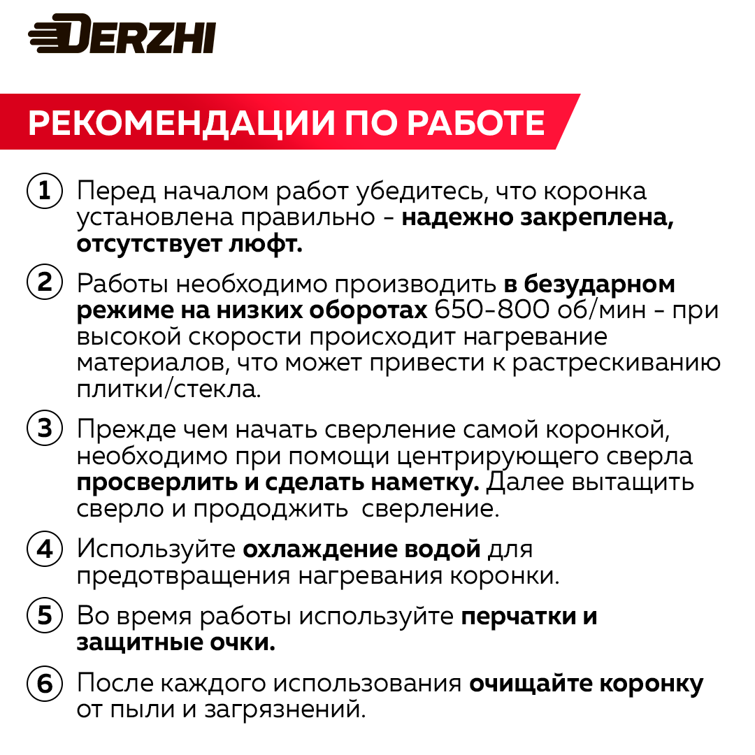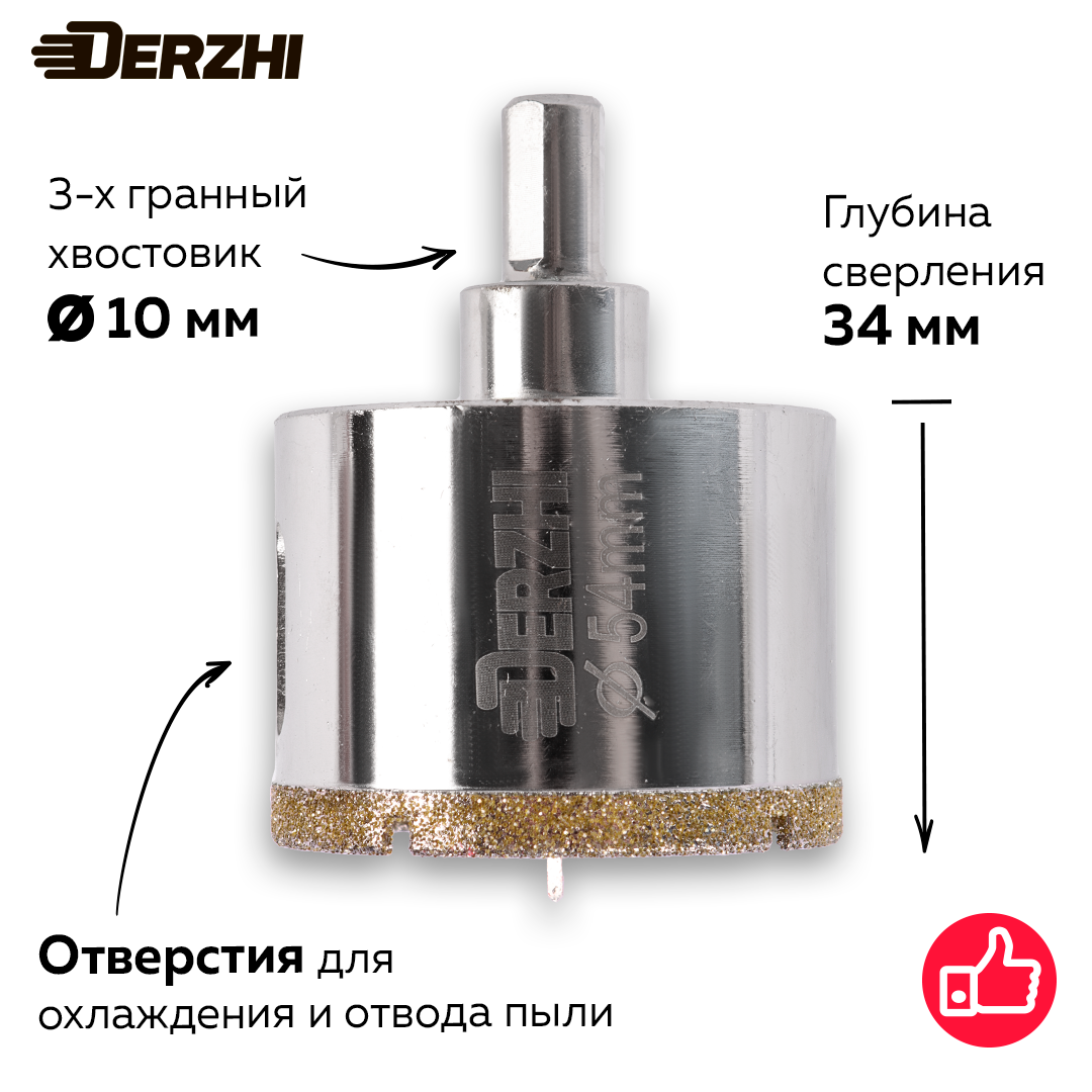 Ниже Вы можете прочитать отзывы на Коронка алмазная с центровочным сверлом для керамики, стекла, керамогранита, 54 мм DERZHI, ознакомится с подробными характеристиками, посмотреть интересные обзоры и фотографии на Коронка алмазная с центровочным сверлом для керамики, стекла, керамогранита, 54 мм DERZHI.
