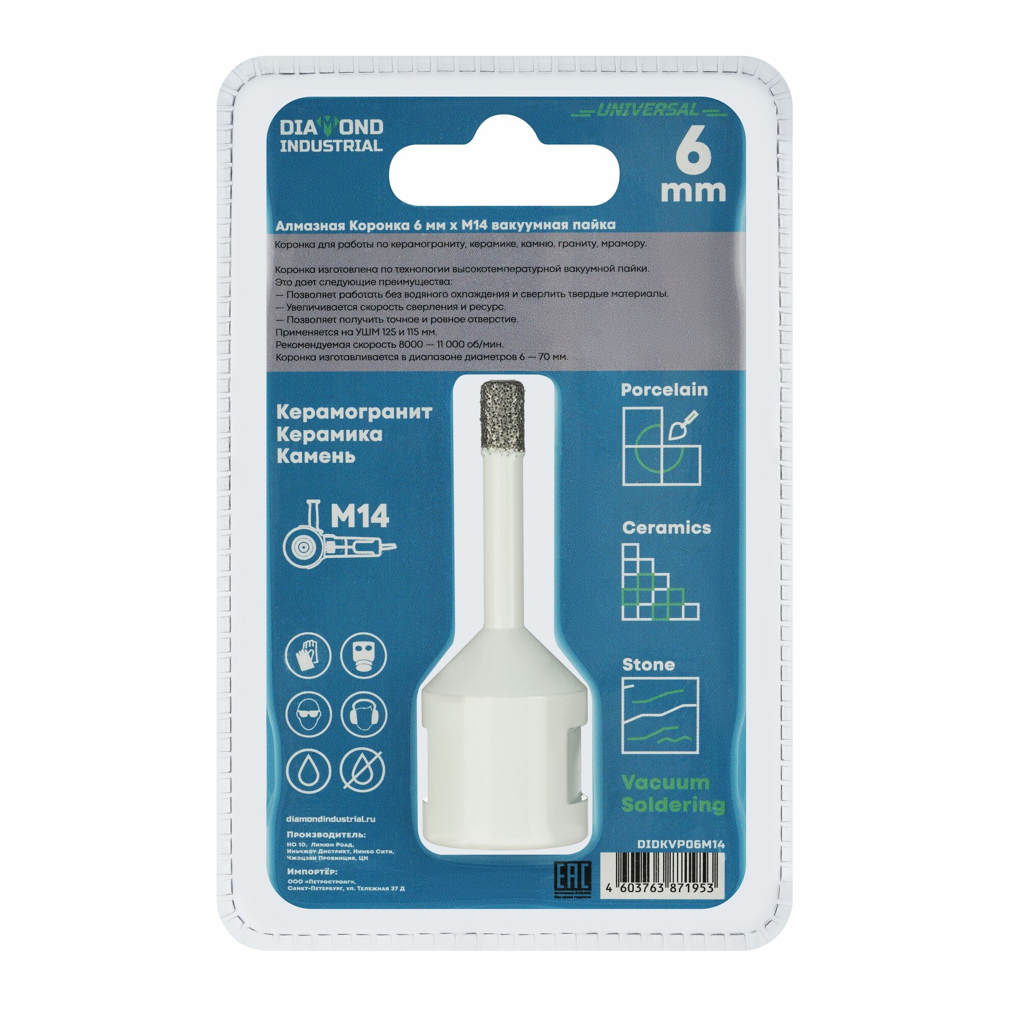 Купить Алмазная коронка по керамограниту, керамике и камню 6 мм Universal Diamond Industrial, вакуумная пайка, M14