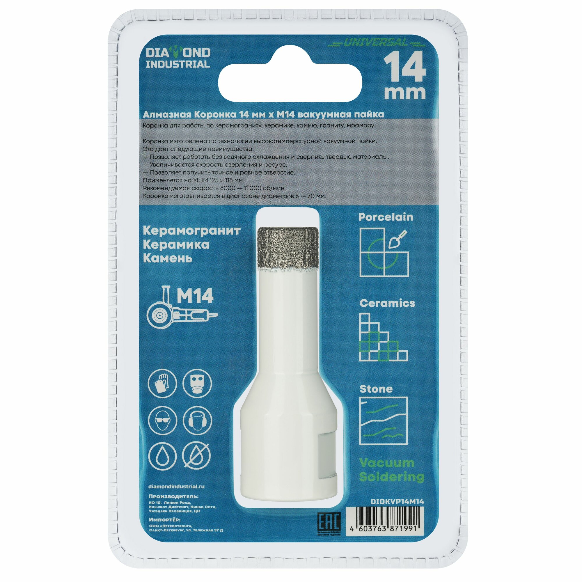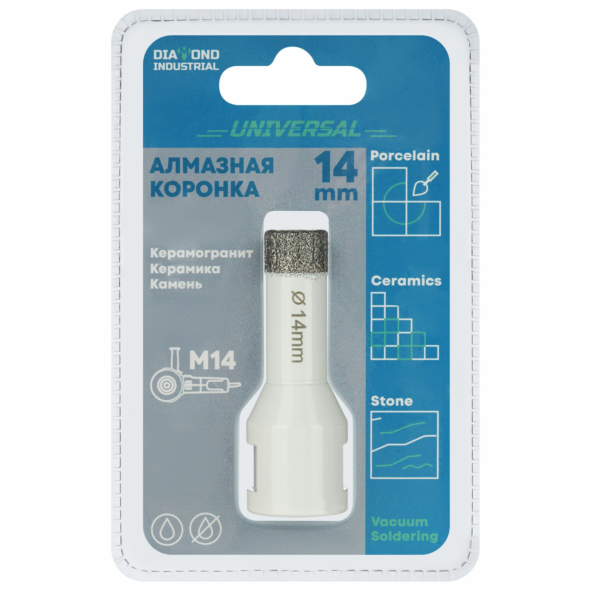 Купить Алмазная коронка по керамограниту, керамике и камню 14 мм Universal Diamond Industrial, вакуумная пайка, M14