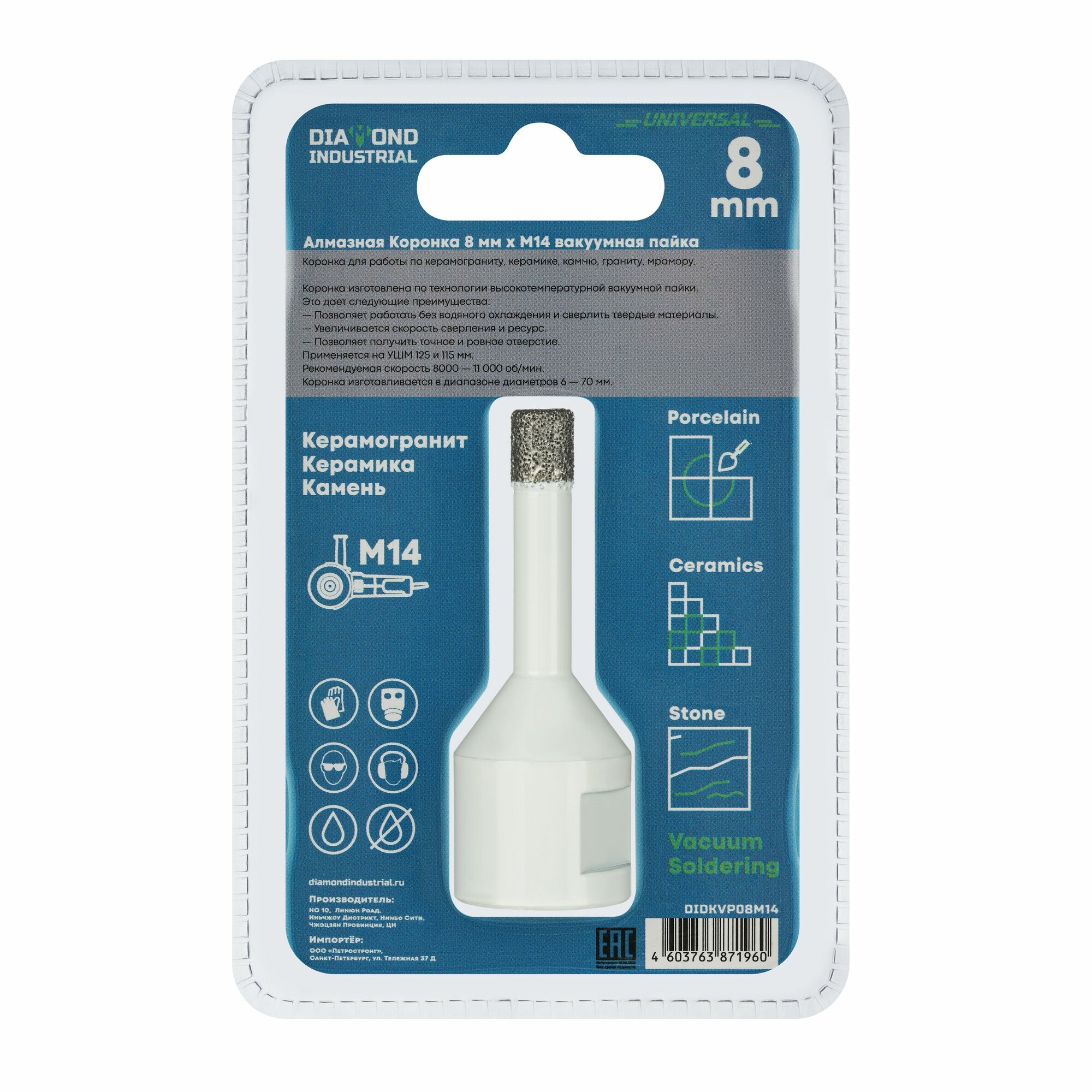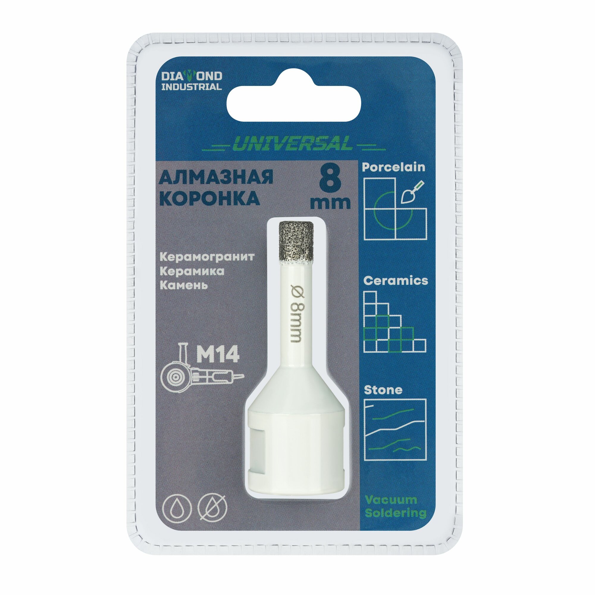 Купить Алмазная коронка по керамограниту, керамике и камню 8 мм Universal Diamond Industrial, вакуумная пайка, M14