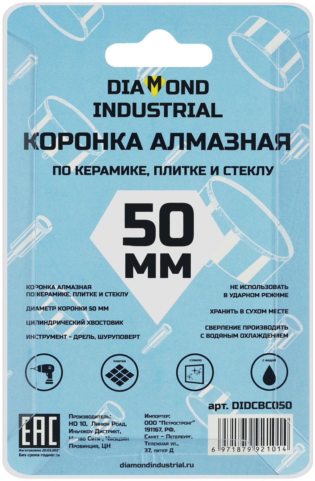 Купить Алмазная коронка по керамике, плитке и стеклу 50 мм Diamond Industrial