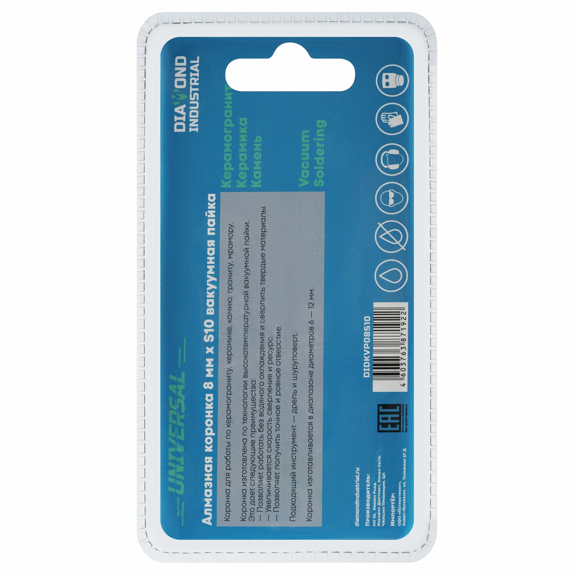 Алмазная коронка по керамограниту, керамике и камню 8 мм Universal Diamond Industrial, вакуумная пайка, M14