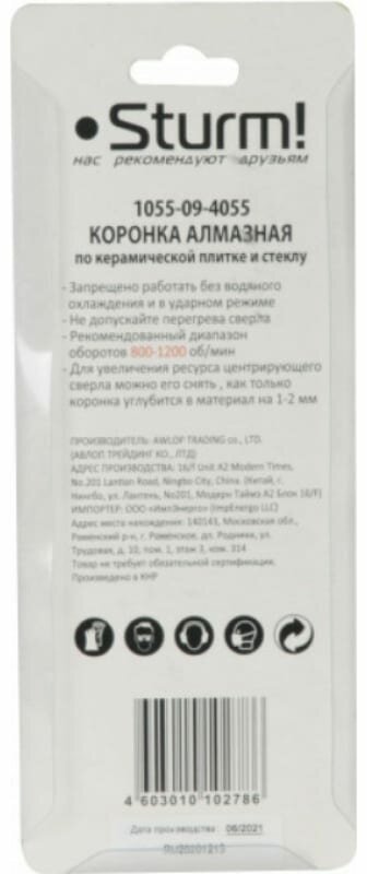 Коронка алмазная по керамике и стеклу (45х55мм, центр. сверло) STURM 1055-09-4555