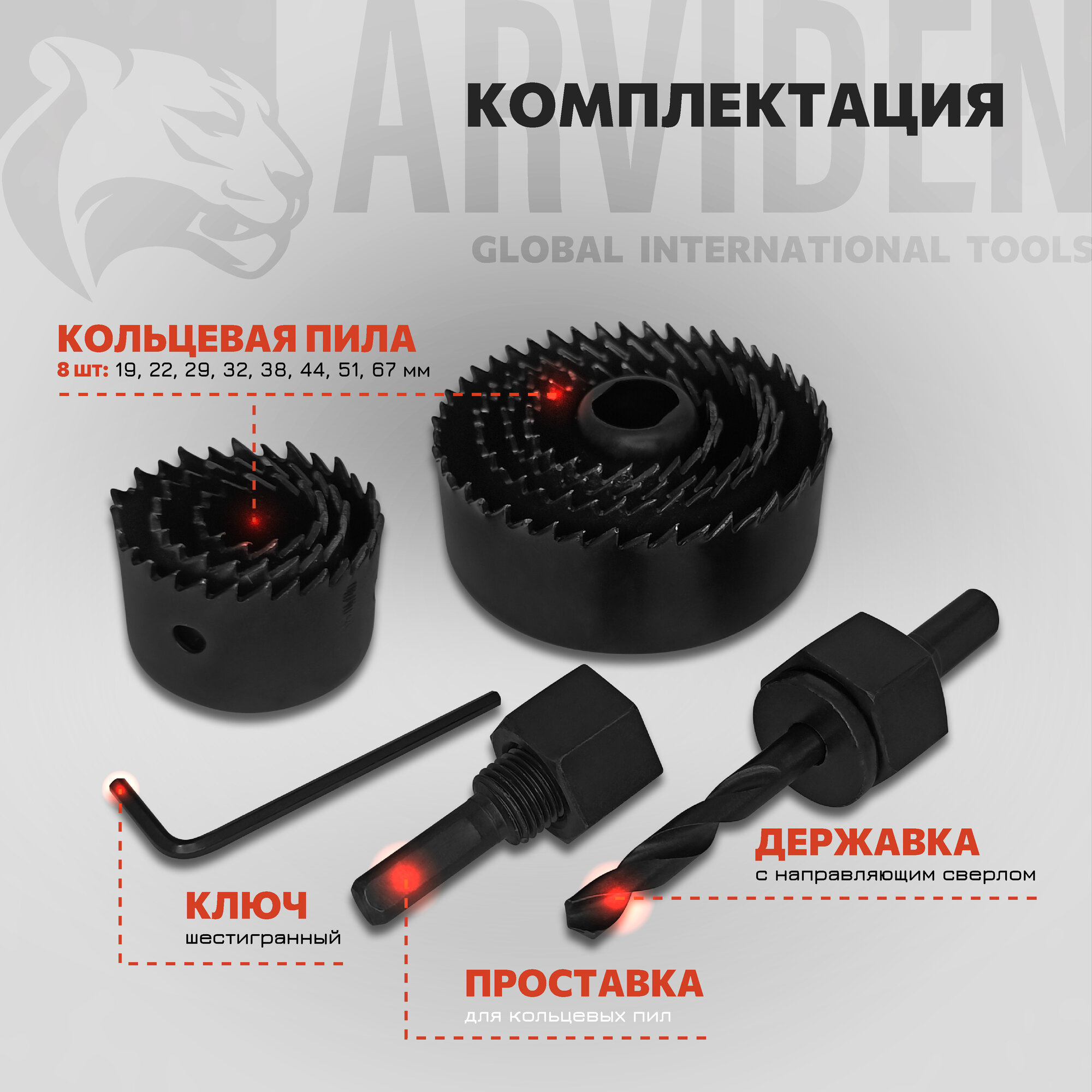 Набор коронок ( кольцевых пил ) по дереву 64-127 мм 5 пил 8 предметов ARVIDEN