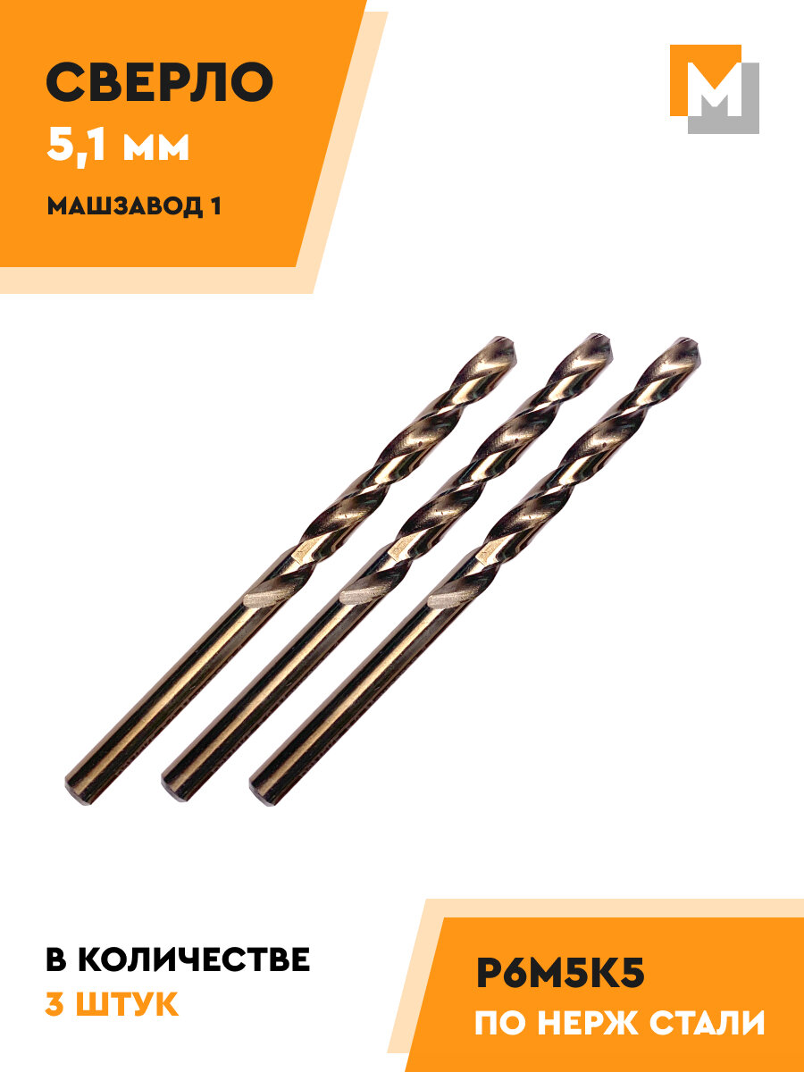 Купить Сверло по металлу 5,1 мм - 3 шт. Р6М5К5 кобальтовое машзавод 1