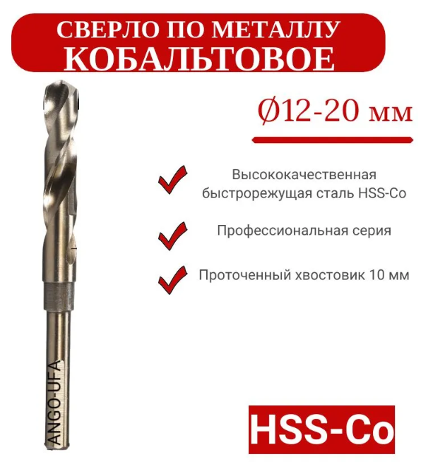 Сверло по металлу Кобальт d 20,0 мм с проточенным хвостовиком 10 мм, цилиндрическое. ANGO-UFA