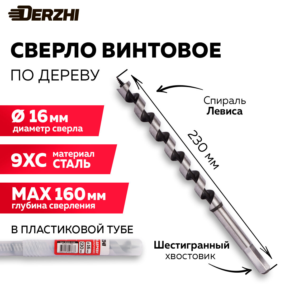 Купить Сверло по дереву винтовое с шестигранным хвостовиком в тубе, 16х230 мм DERZHI