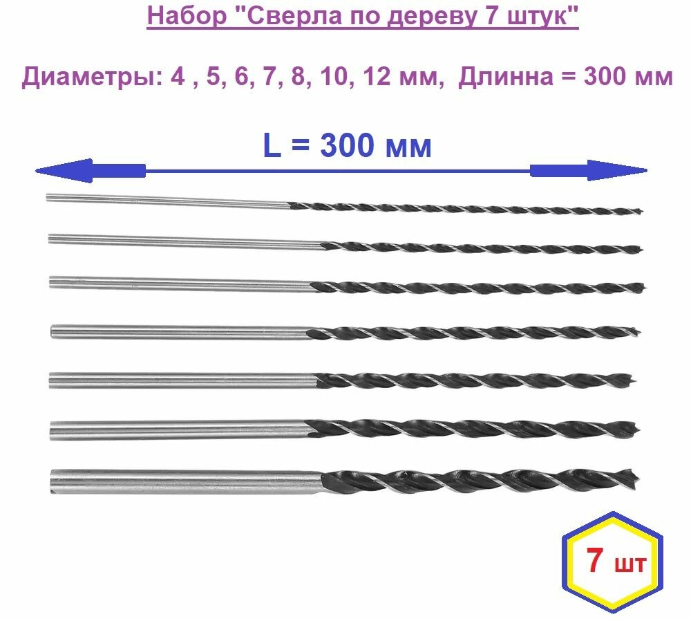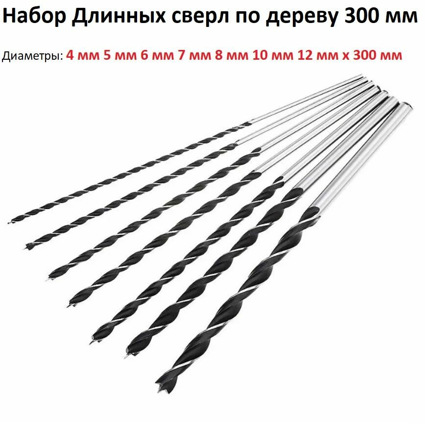 Набор Длинных сверл по дереву 300 мм / Диаметры 4 мм 5 мм 6 мм 7 мм 8 мм 10 мм 12 мм x 300 мм / Сверла для Мягких пород дерева, пластику длинное 7 штук интересное:
