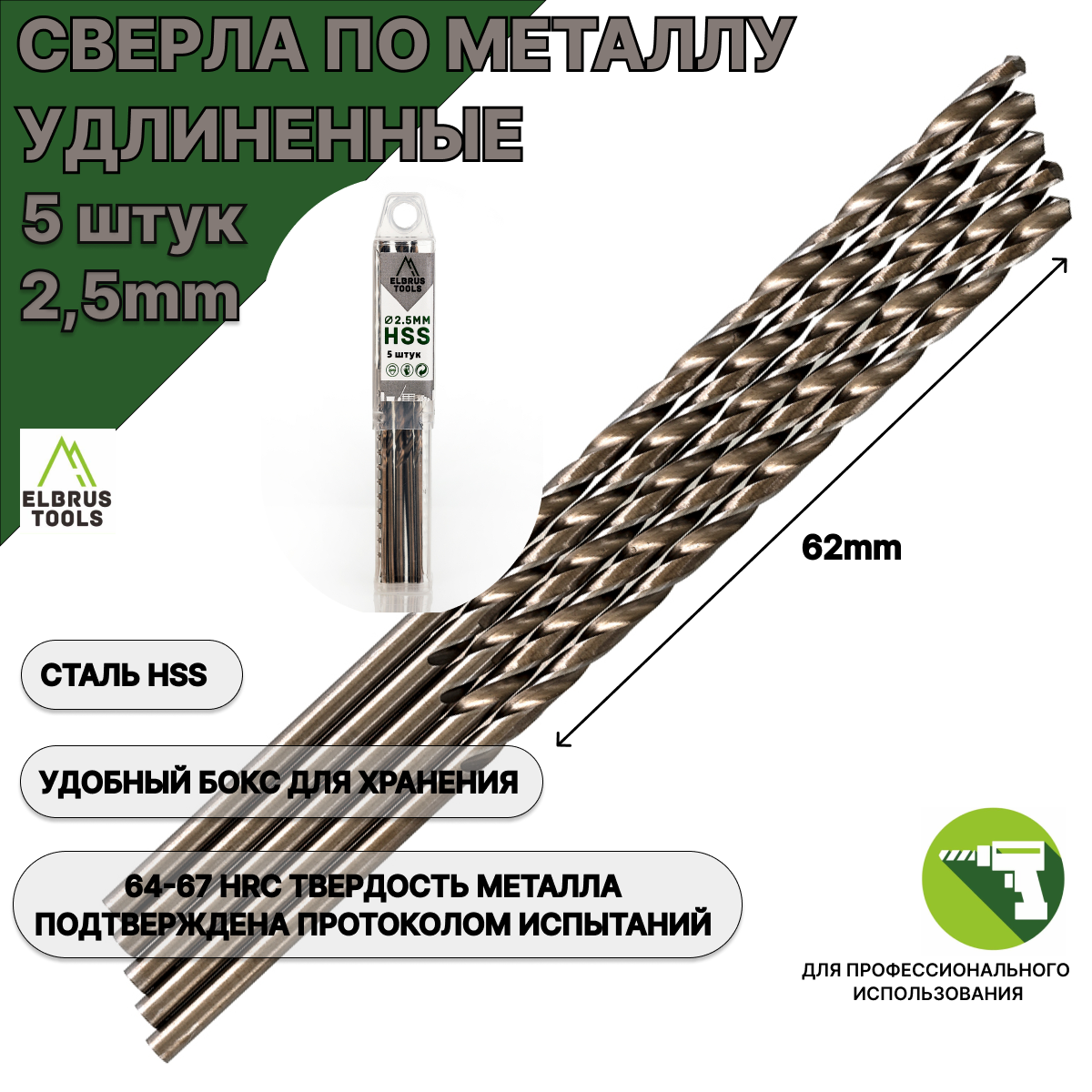 Купить Сверла по металлу удлиненные 2.5 мм - 5 шт Сталь Р4М3 DIN340