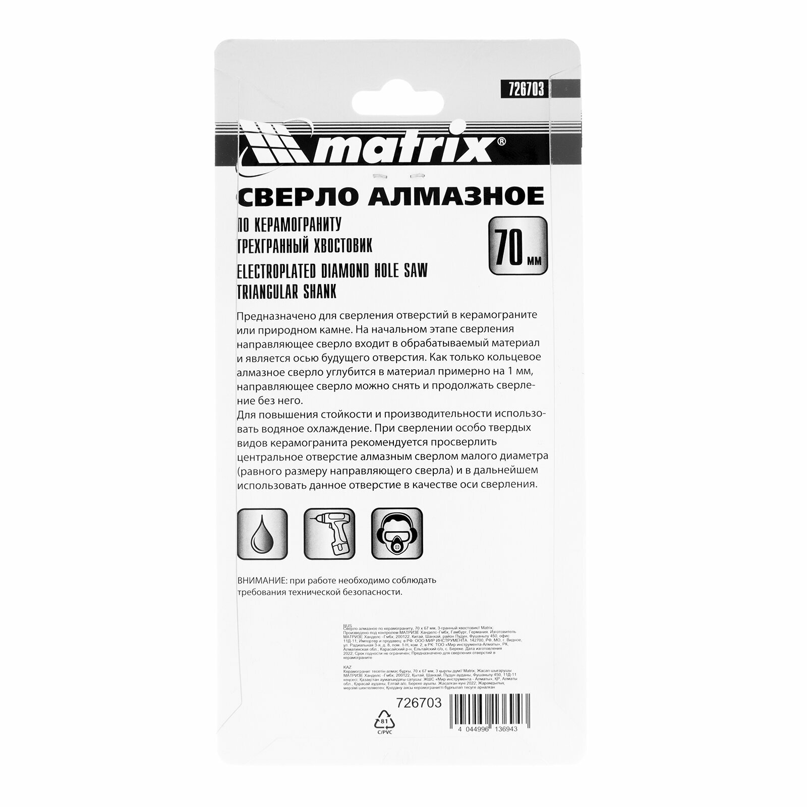Сверло алмазное по керамограниту Matrix 70 х 67 мм, 3-гранный хвостовик 726703 интересное:
