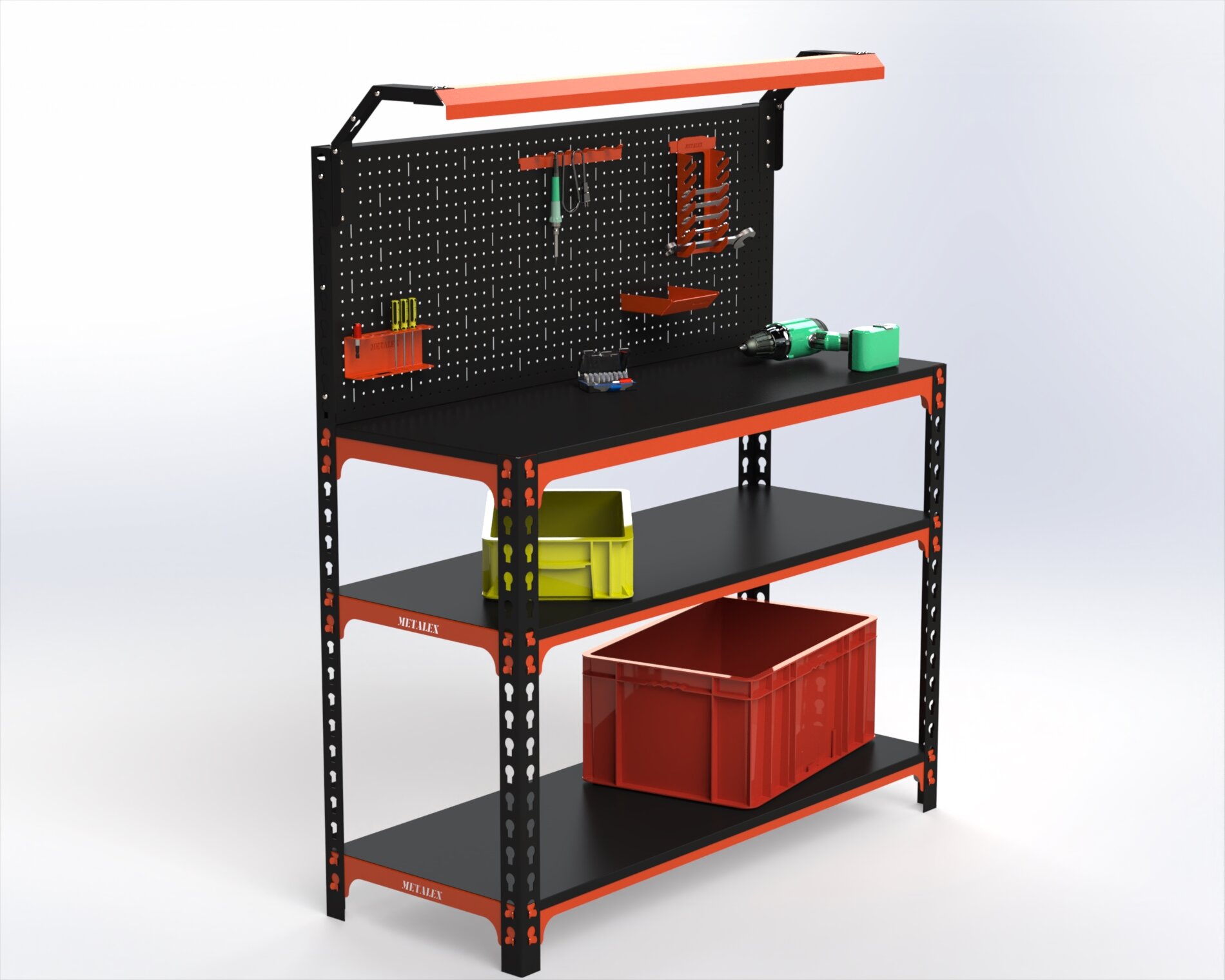 Верстак Metalex серия SUN 950х1100х600 (2-е полки, + перфопанель с комплектом освещения) оранжево-чёрный интересное: