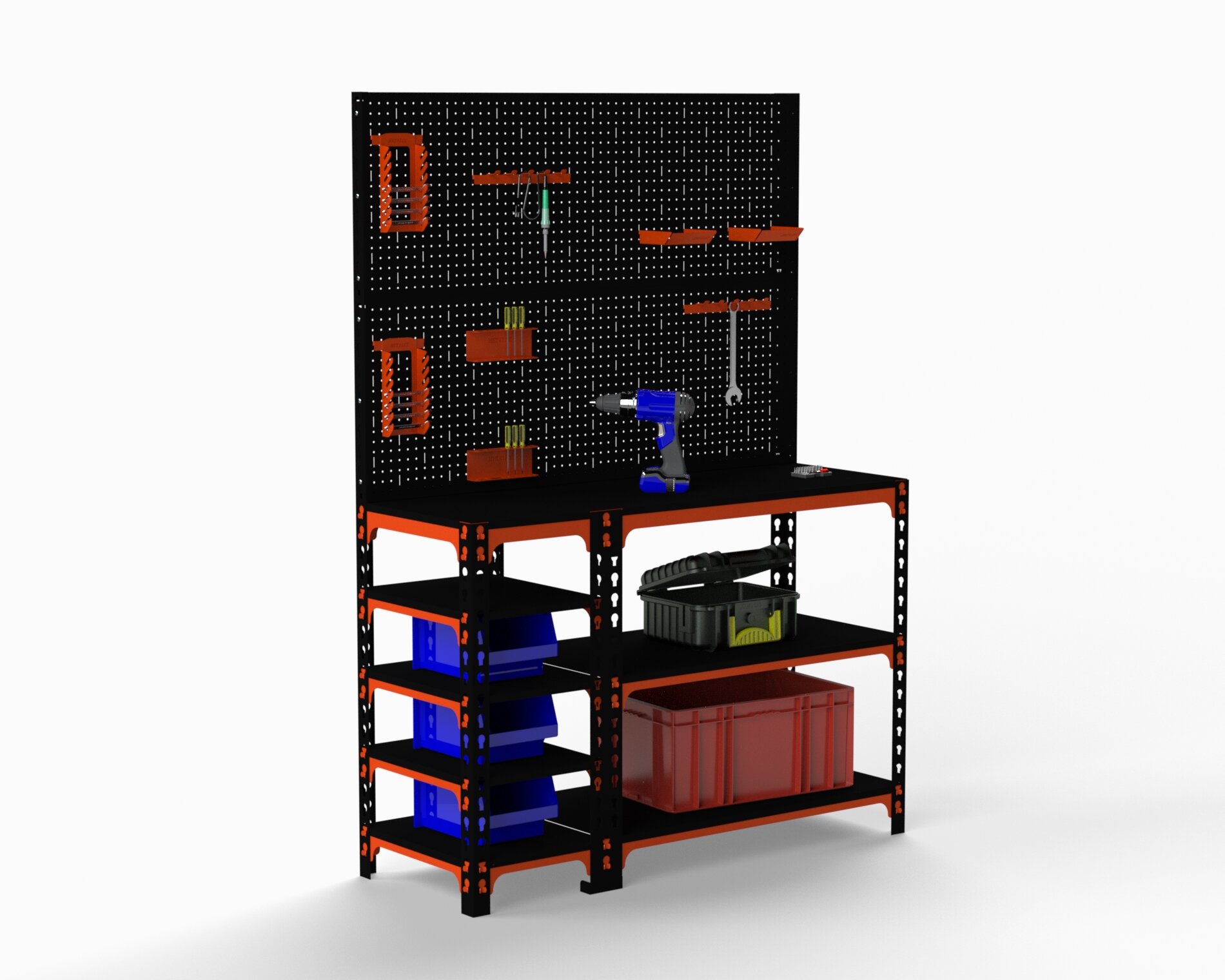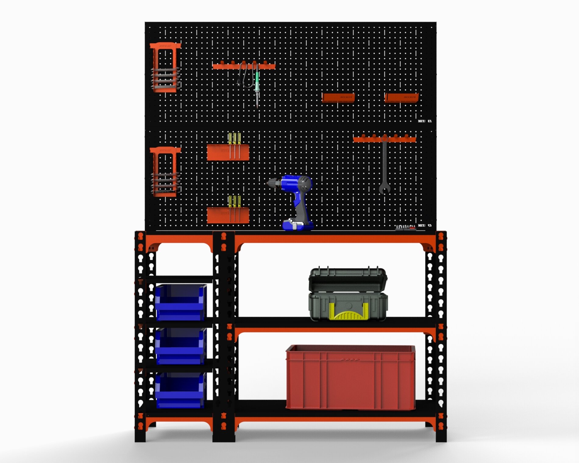 Стол-верстак Metalex 950х1000х500 (с бок. полками, двумя перфопанелями и комп. аксессуаров) оранжево-чёрный интересное: