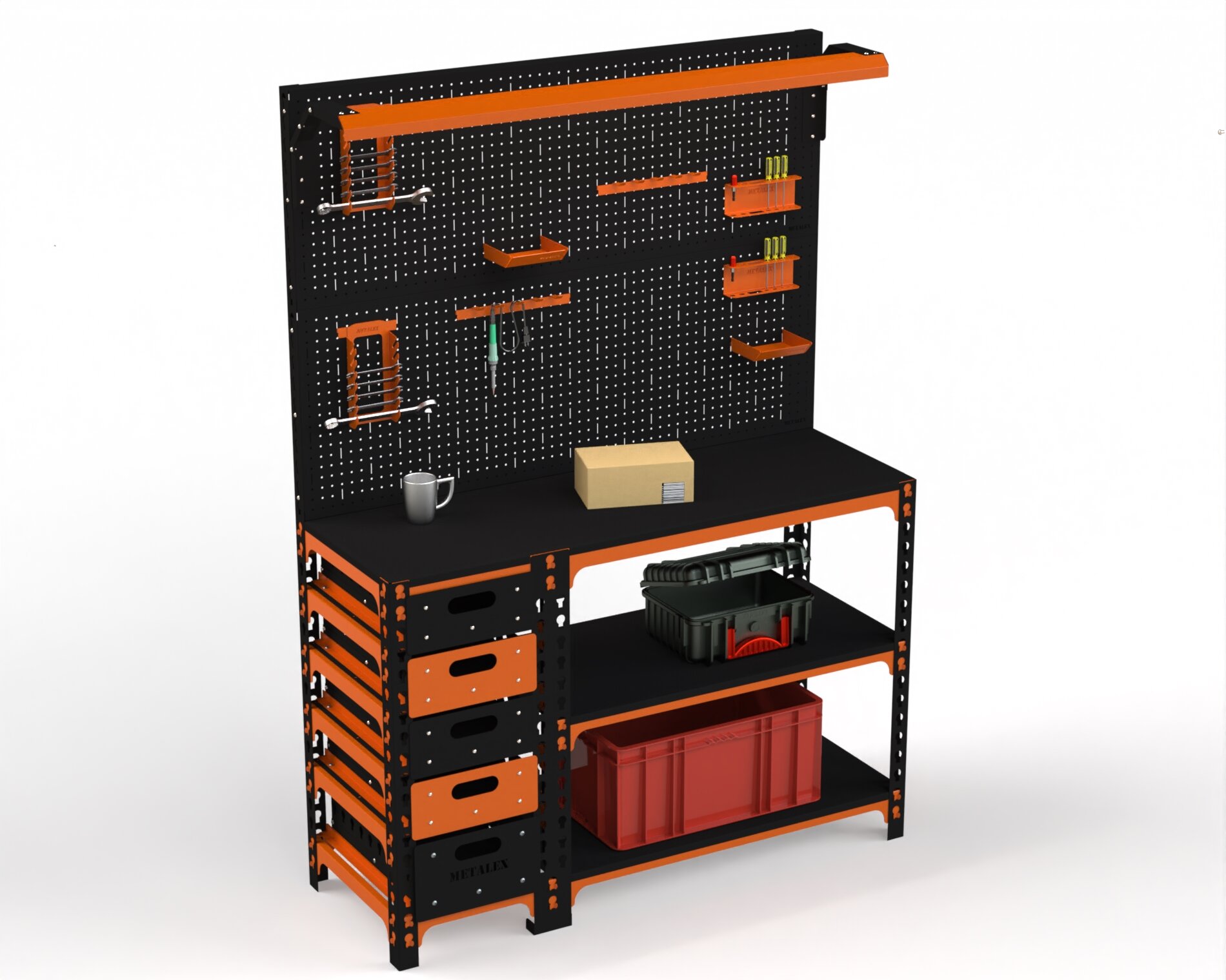 Верстак Metalex серия SUN 950х1000х400 (с бок. тумбой, 2-мя панелями и комплектом освещения) оранжево-чёрный интересное: