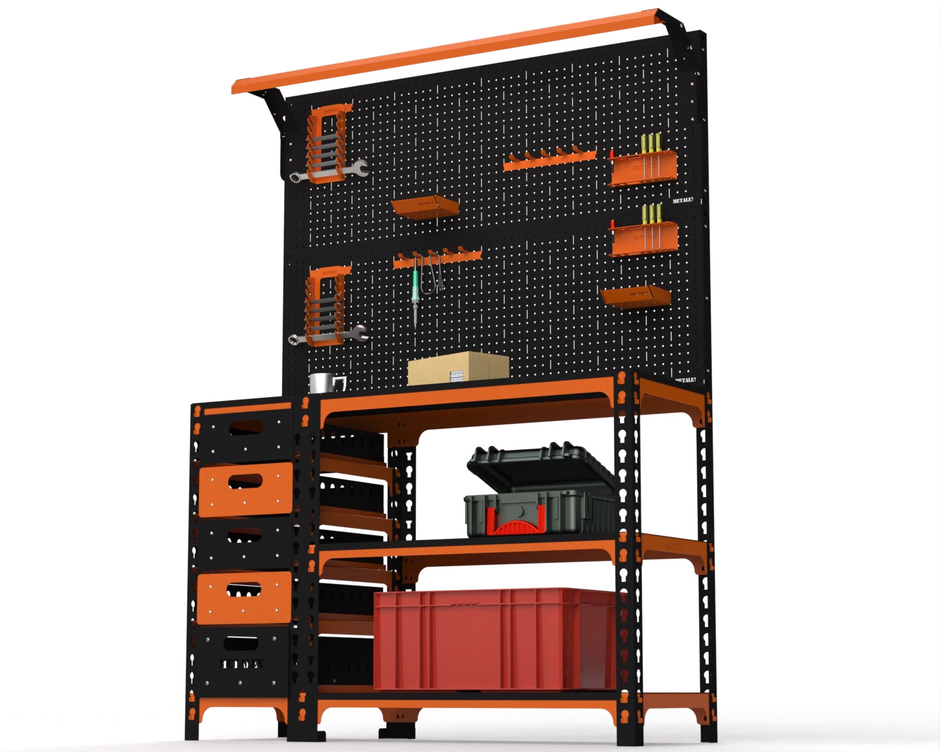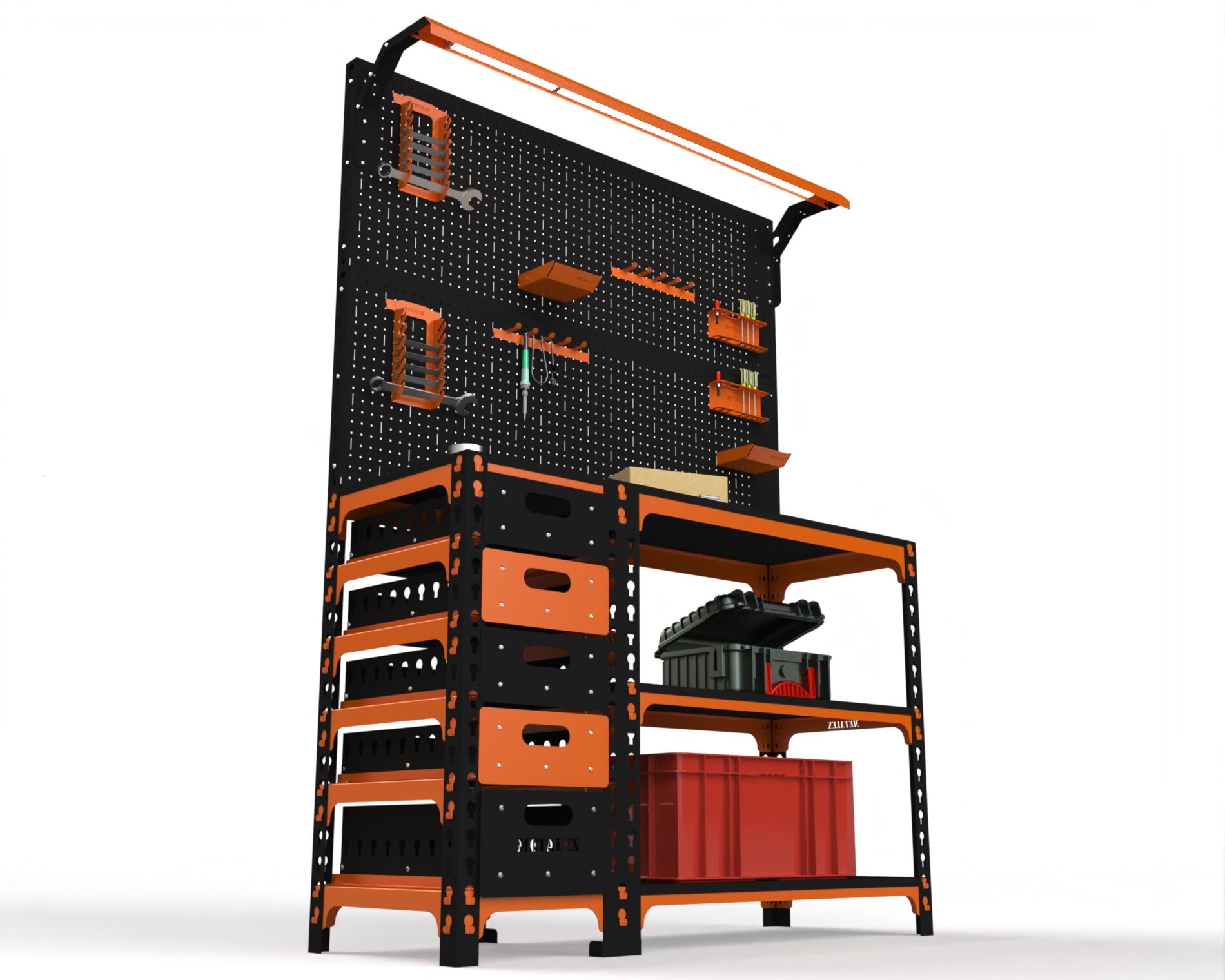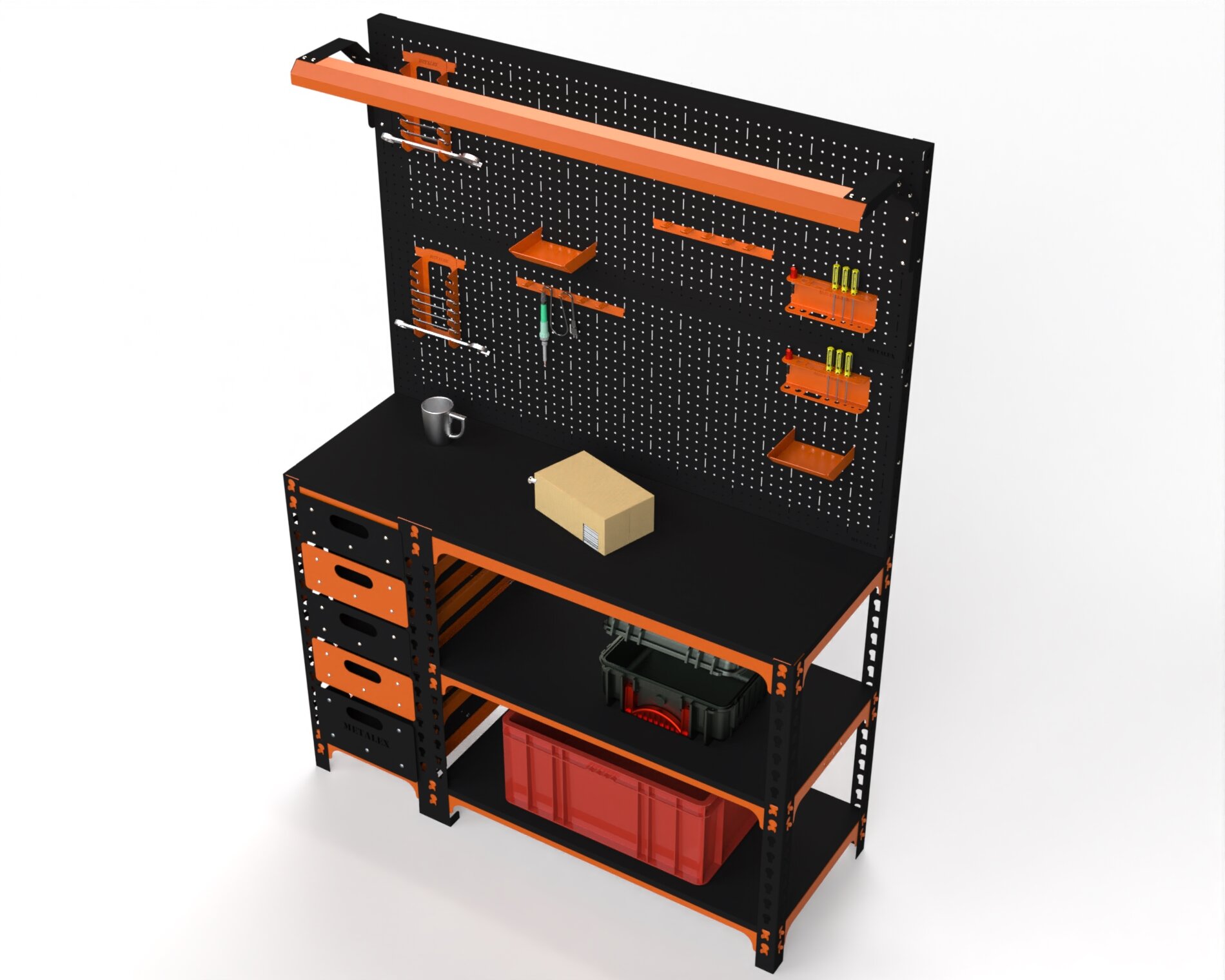 Купить Верстак Metalex серия SUN 950х1000х400 (с бок. тумбой, 2-мя панелями и комплектом освещения) оранжево-чёрный