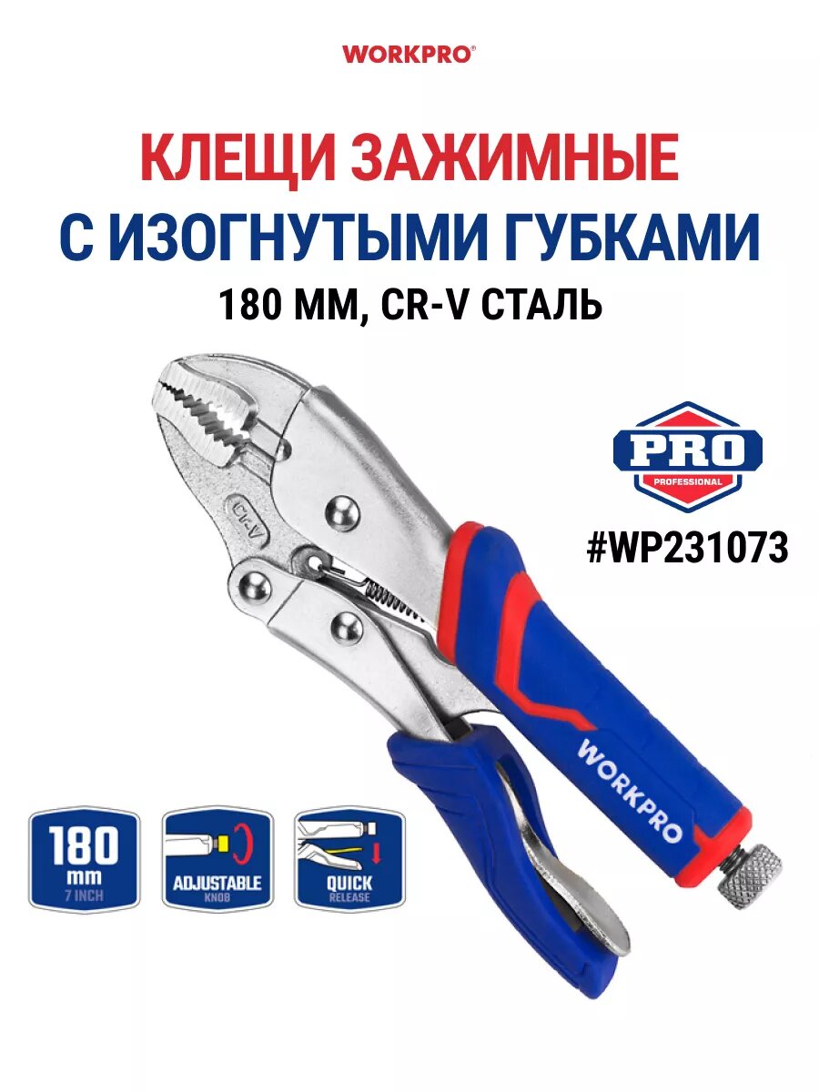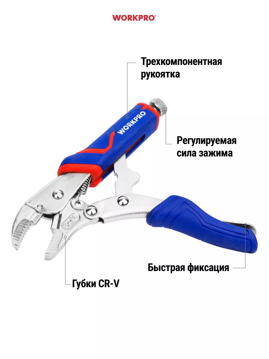 Клещи зажимные 180 мм с изогнутыми губками, WP231073, WORKPRO, цвет синий/красный интересное: