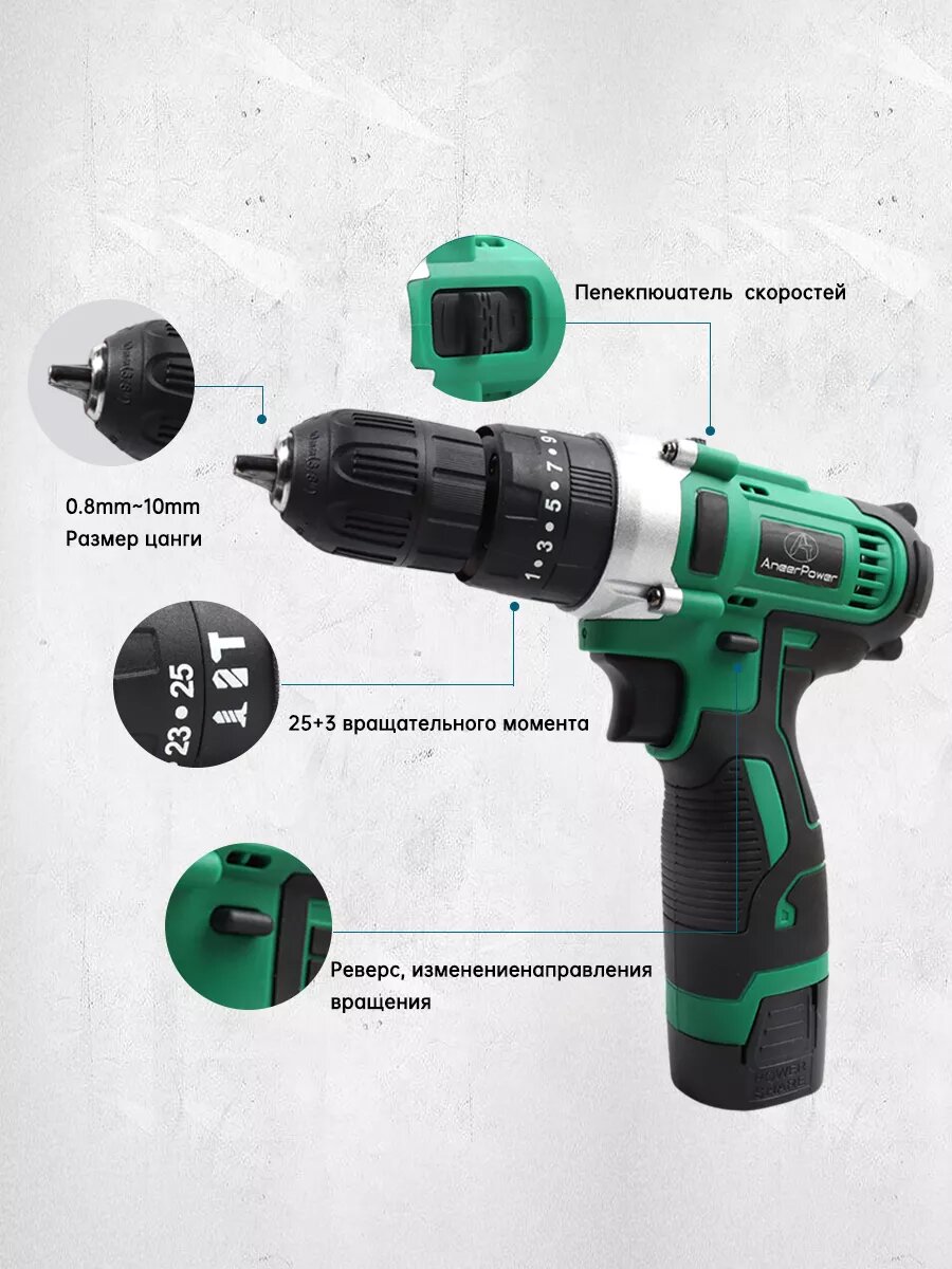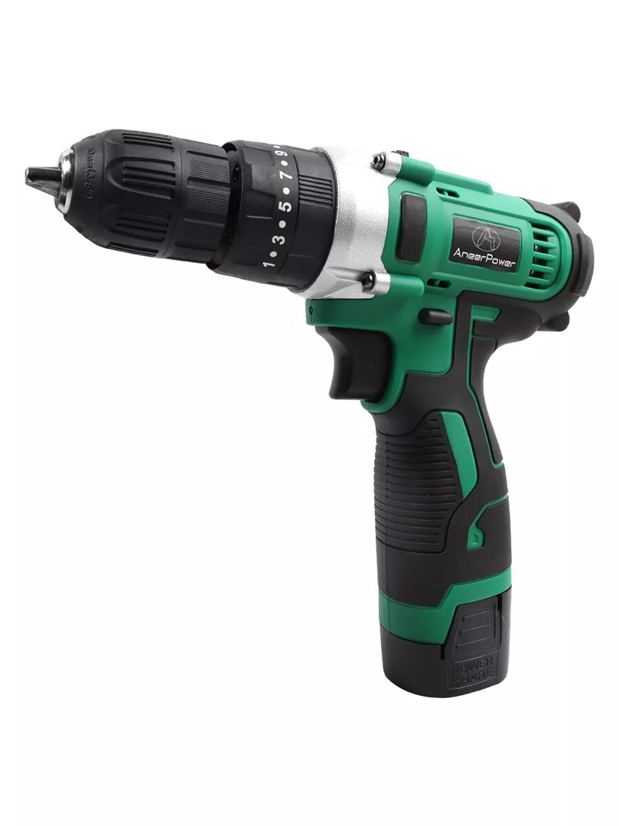 Шуруповёрт Aneerpower, ударный, 16.8 В, зелёный, 0.8-10мм, 550-1500об/мин, 3 режима 2 аккумулятора по 1,5 Ач. интересное: