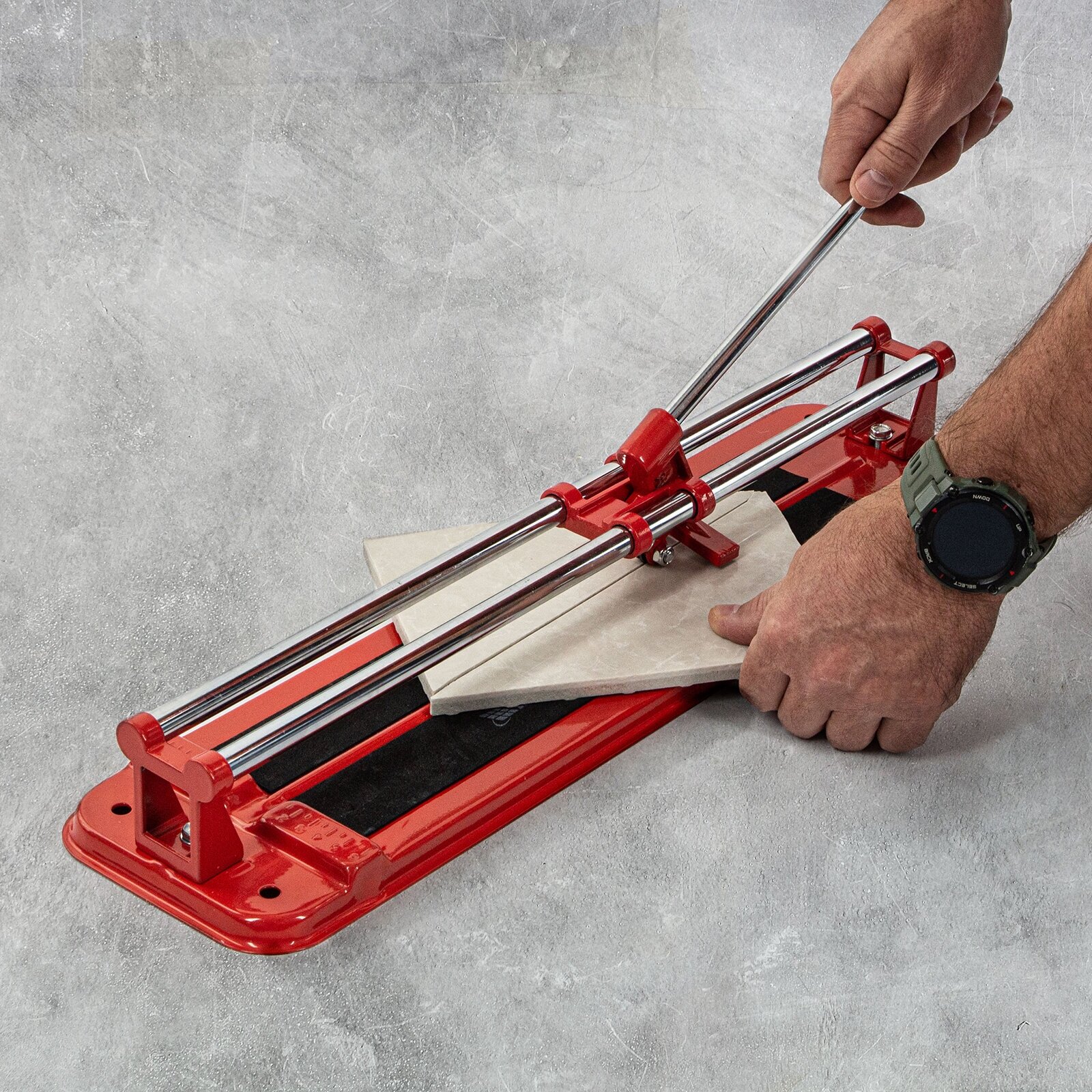 | Минусы: | Не удобно держать плитку точно по линии реза, не хватает держателей плитки. |