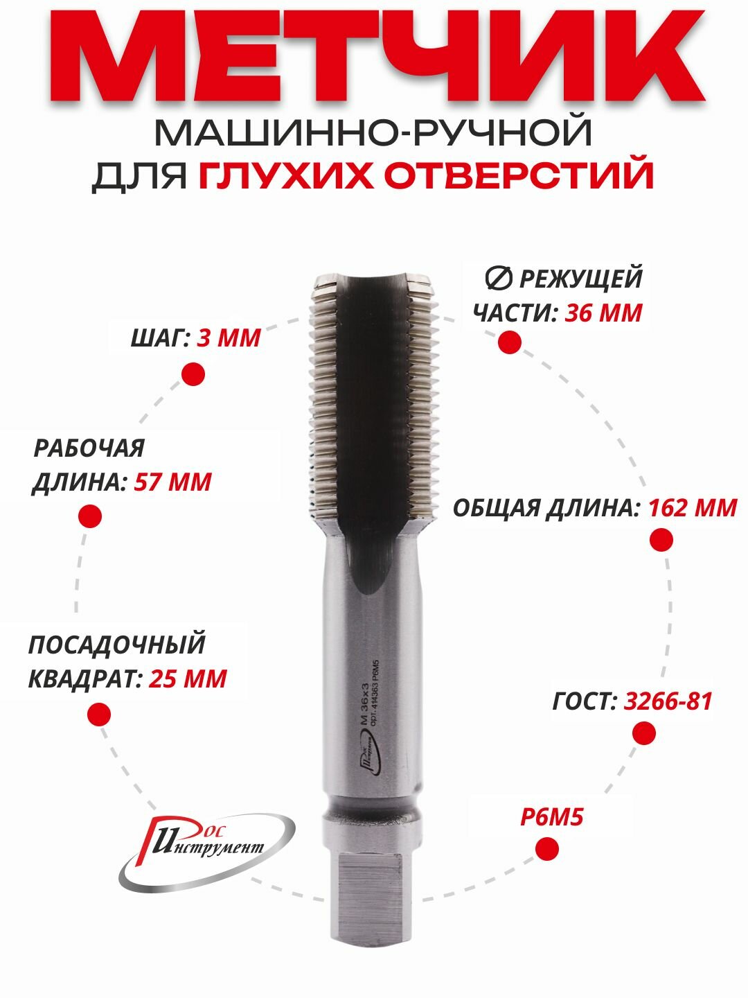 Купить Метчик машинно-ручной 36 х 3,0 ,1 штука для глухих отверстий, ГОСТ 3266-81 Р6М5