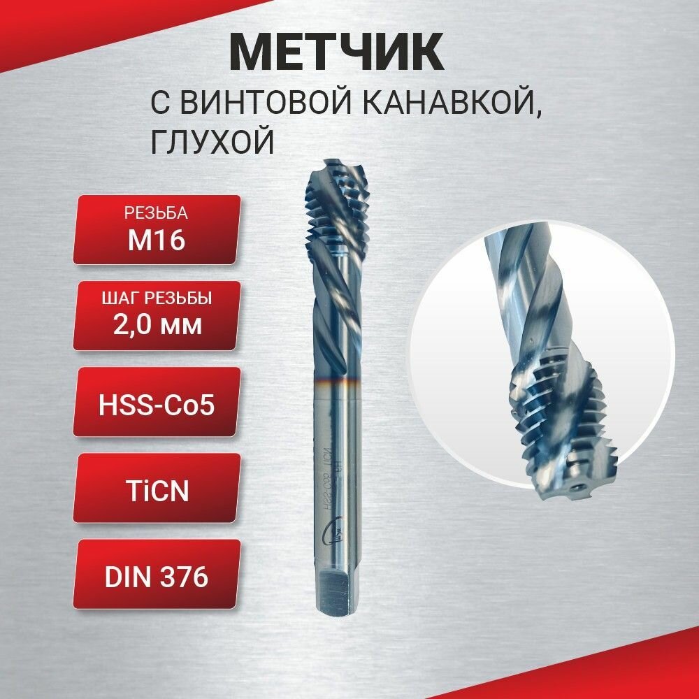 Купить Метчик с винтовой канавкой, глухой М 16х2 HSS-Со5 TiCN DIN376, шт