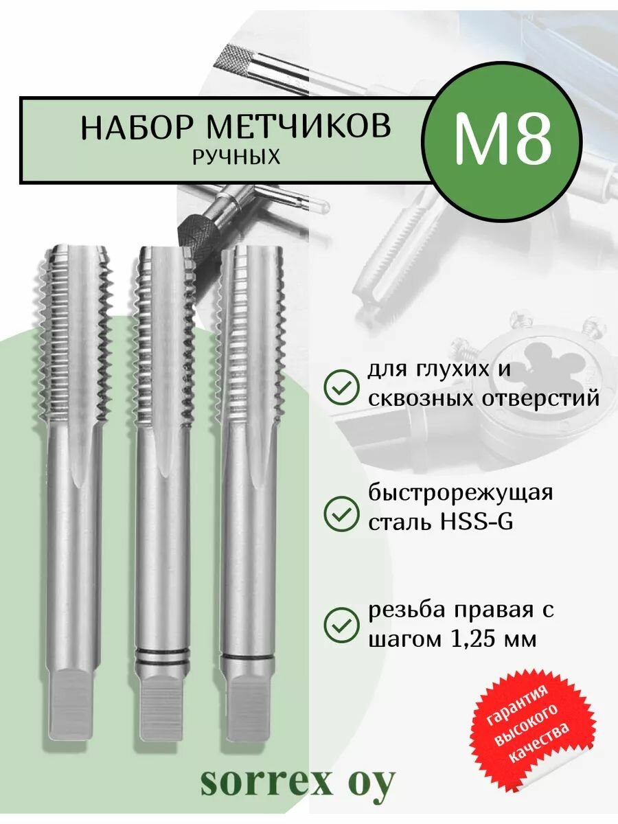 Купить Метчики ручные M8 набор 3 шт из быстрорежущей стали DIN 352 6H для нарезания метрической резьбы по металлу, глухие и сквозные отверстия 00105210-S Sorrex