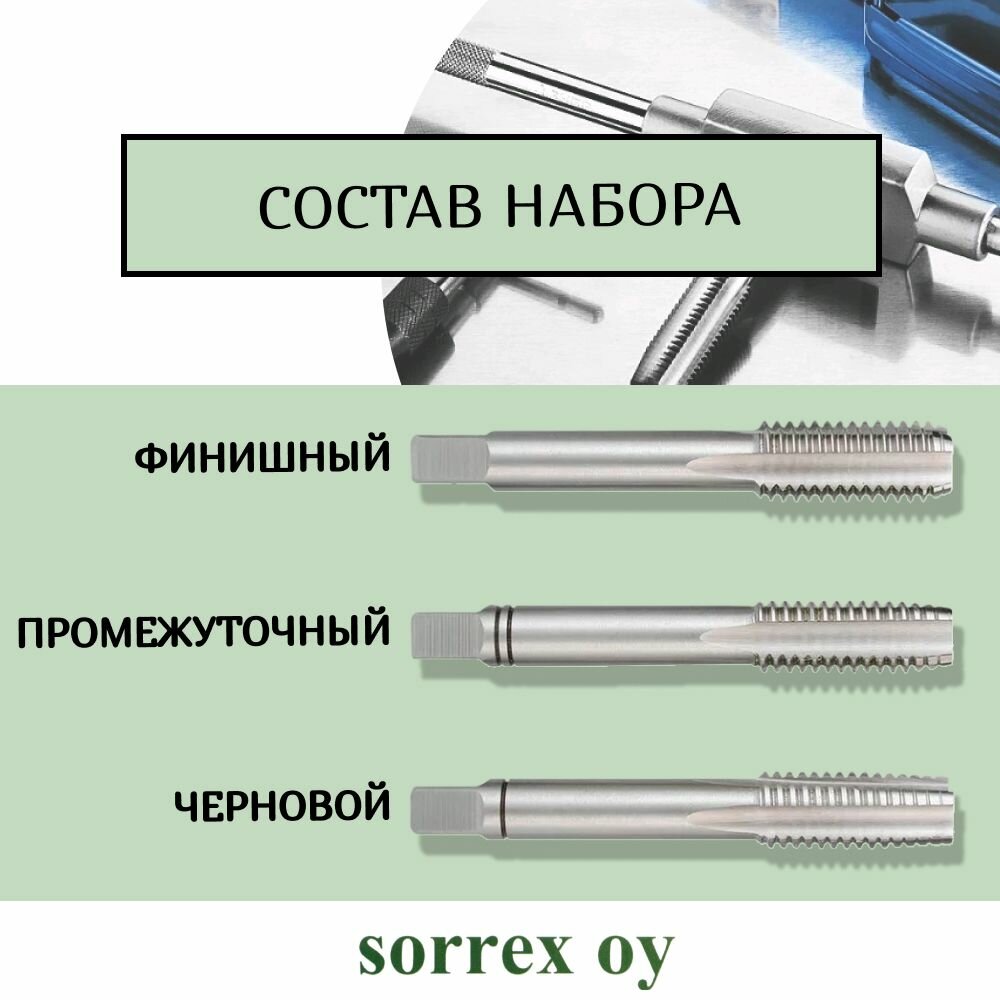 Метчики ручные M8 набор 3 шт из быстрорежущей стали DIN 352 6H для нарезания метрической резьбы по металлу, глухие и сквозные отверстия 00105210-S Sorrex