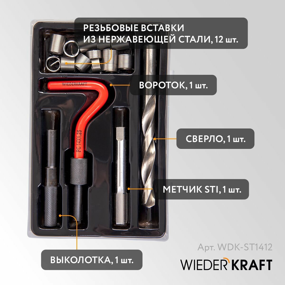 Набор для восстановления резьбы M12X1,75, 16 предметов WIEDERKRAFT WDK-ST1217