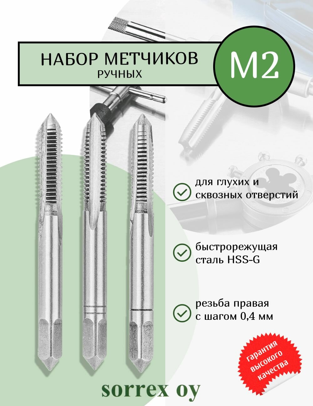Купить Метчики ручные M2 набор 3 шт из быстрорежущей стали DIN 352 6H для нарезания метрической резьбы по металлу, глухие и сквозные отверстия 00105080-S Sorrex