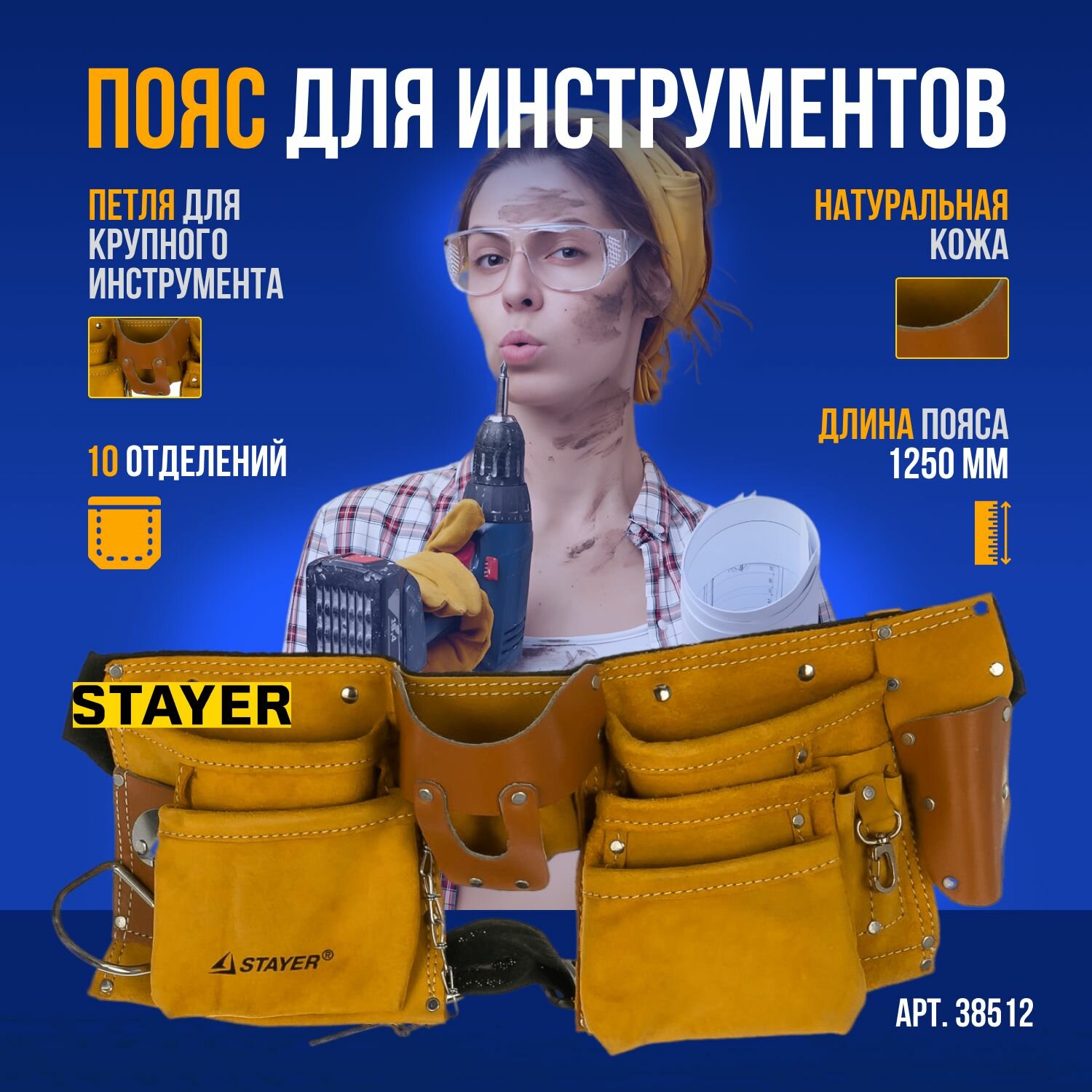STAYER кожаный, 10 карманов, 3 подвески, пояс для инструментов (38512)