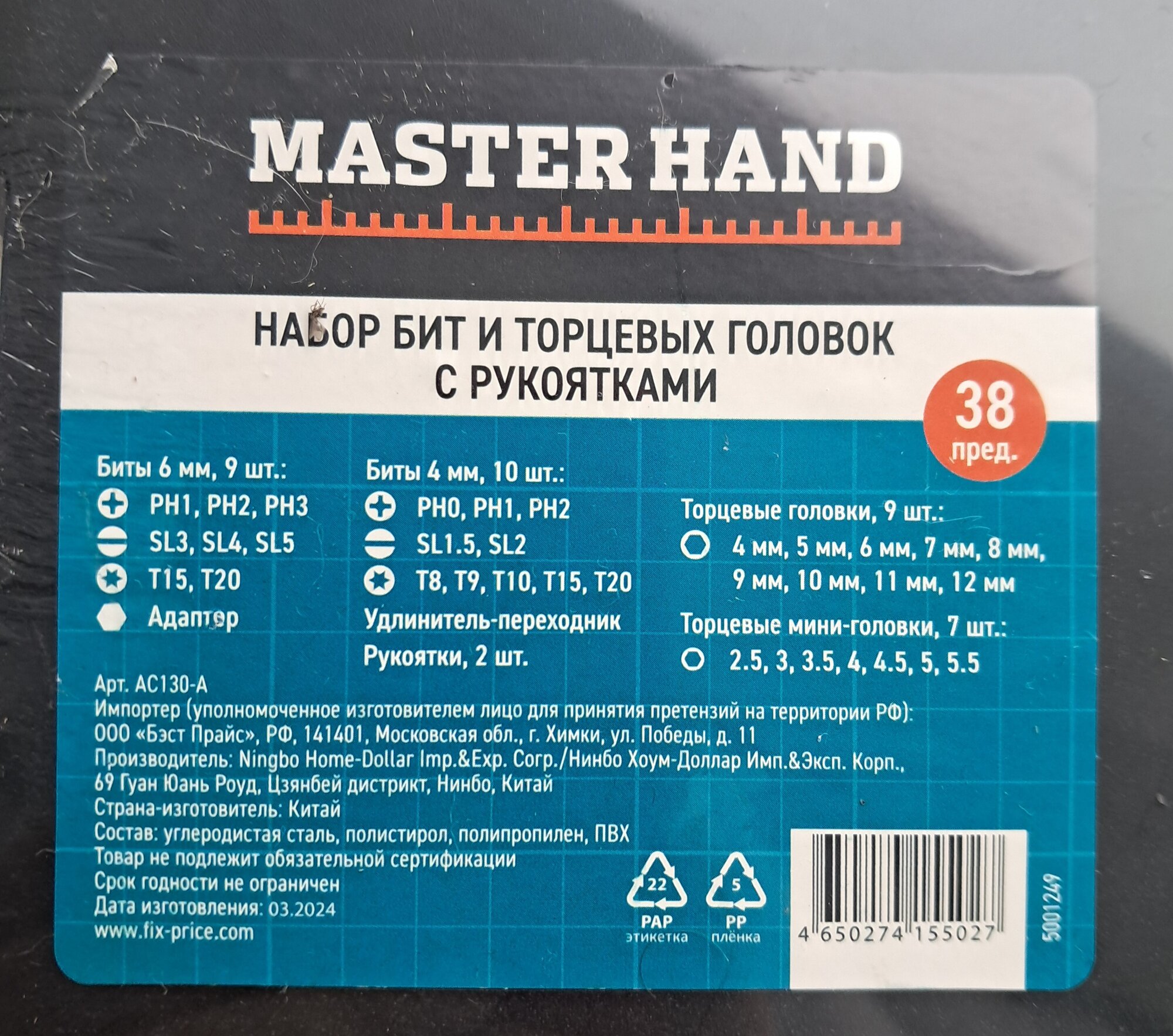 Набор бит и торцевых головок с рукоятками, Master Hand, 38 предметов в кейсе интересное: