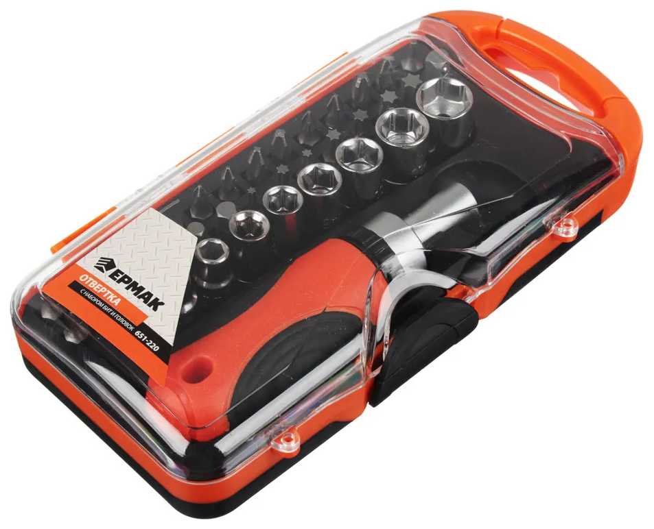 Отвертка с набором бит и головок ермак, 38 предметов, удобная рукоятка, в футляре интересное: