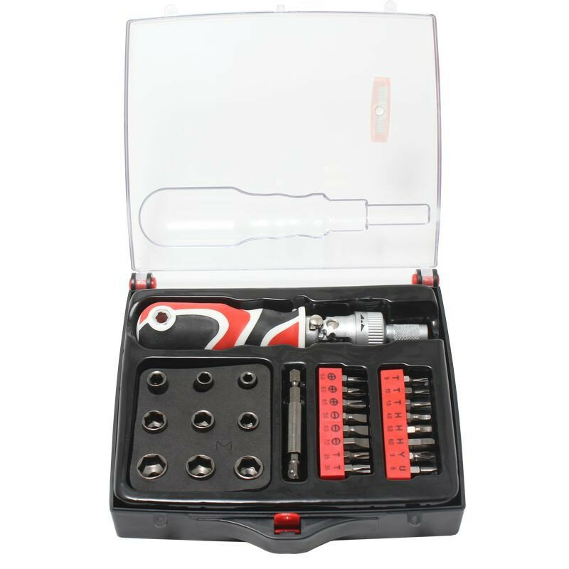 Купить Отвертка реверсивная поворотная, усиленная с комплектом бит и головок (27 шт.) в пластиковом футляре.